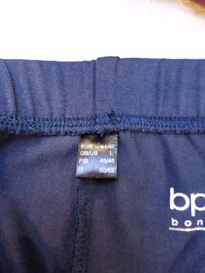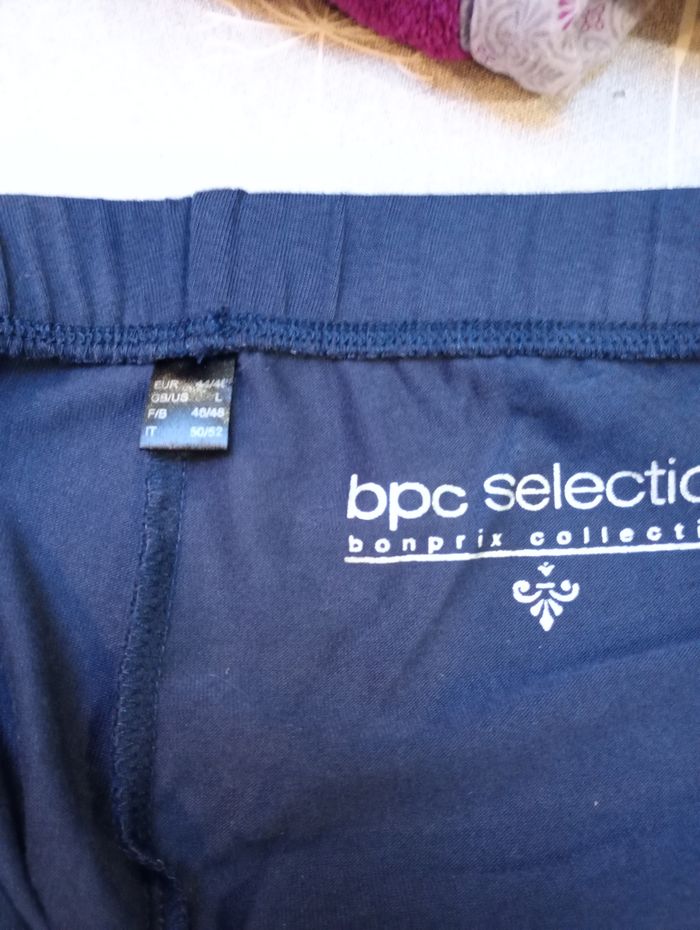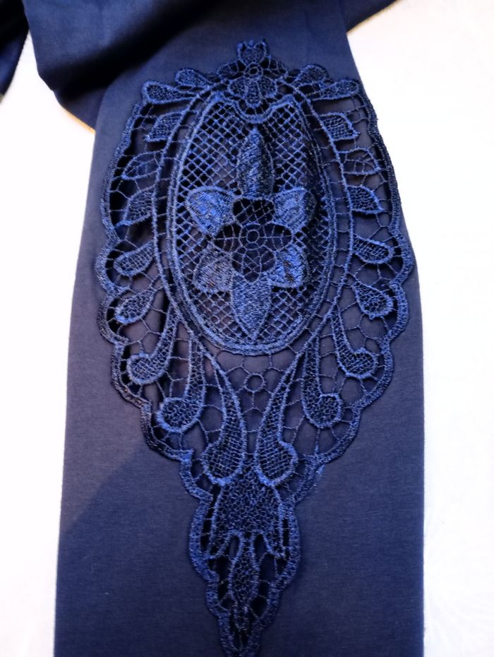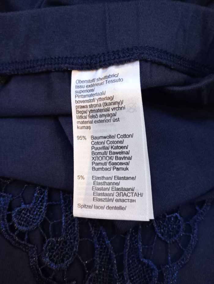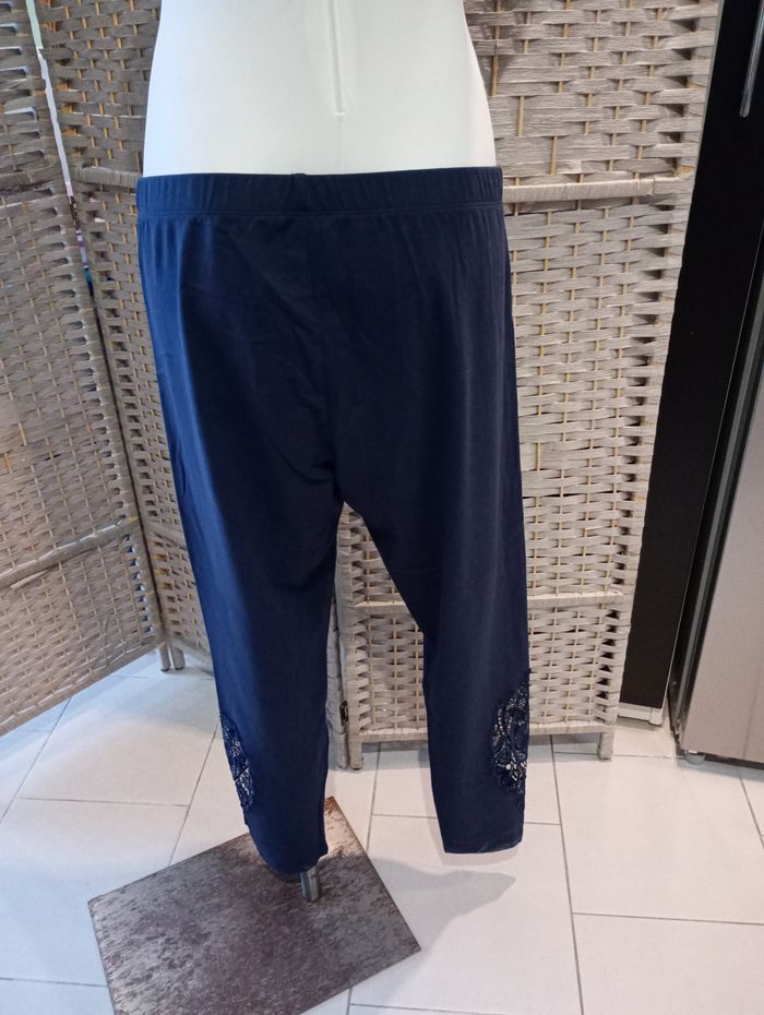 Legging bleu marine avec dentelle sur le bas des jambes. Taille : 44/46 EUR 46/48 F/B - L. Longueur : 90 cm Largeur : 39 cm Entrejambe : 69 cm Marque : BPC Sélection (Bonprix). Acheté à 29,99 €. Neuf sans étiquette.