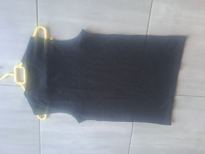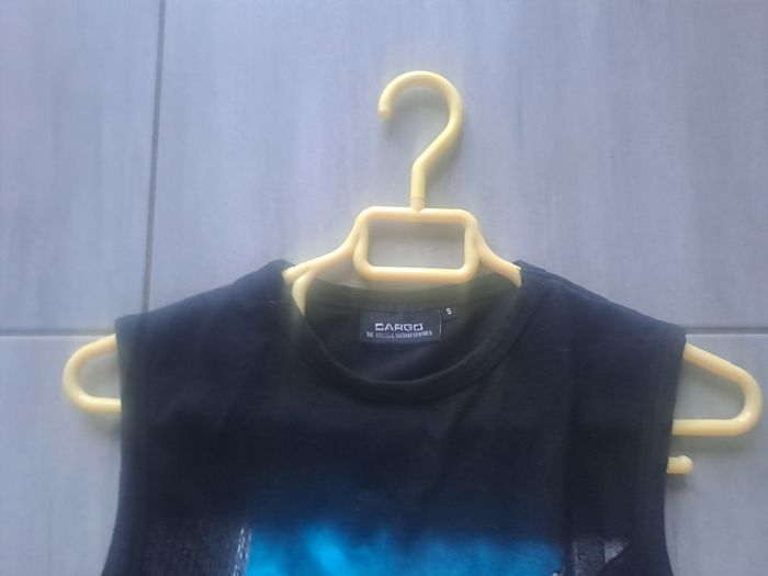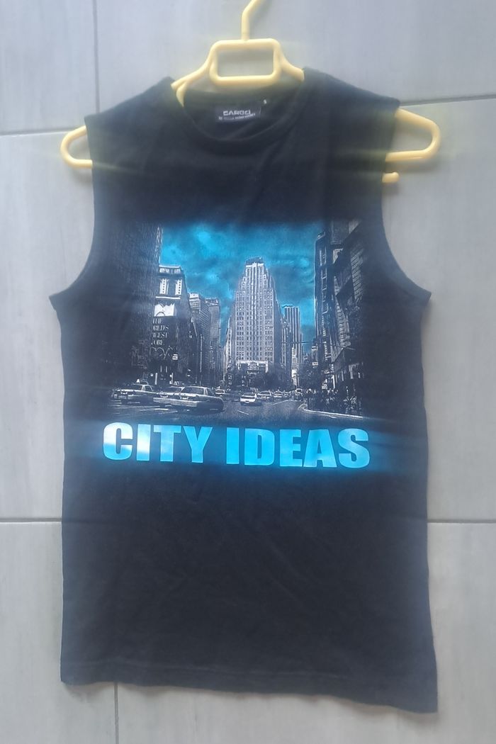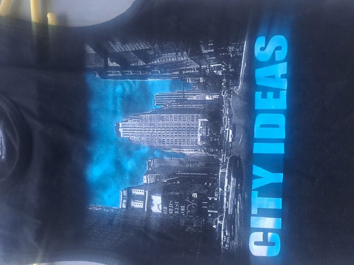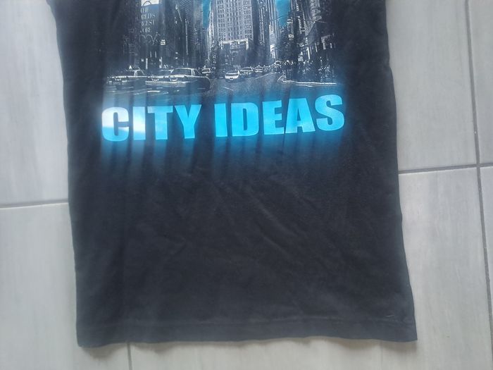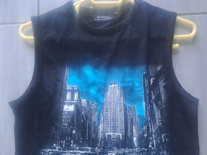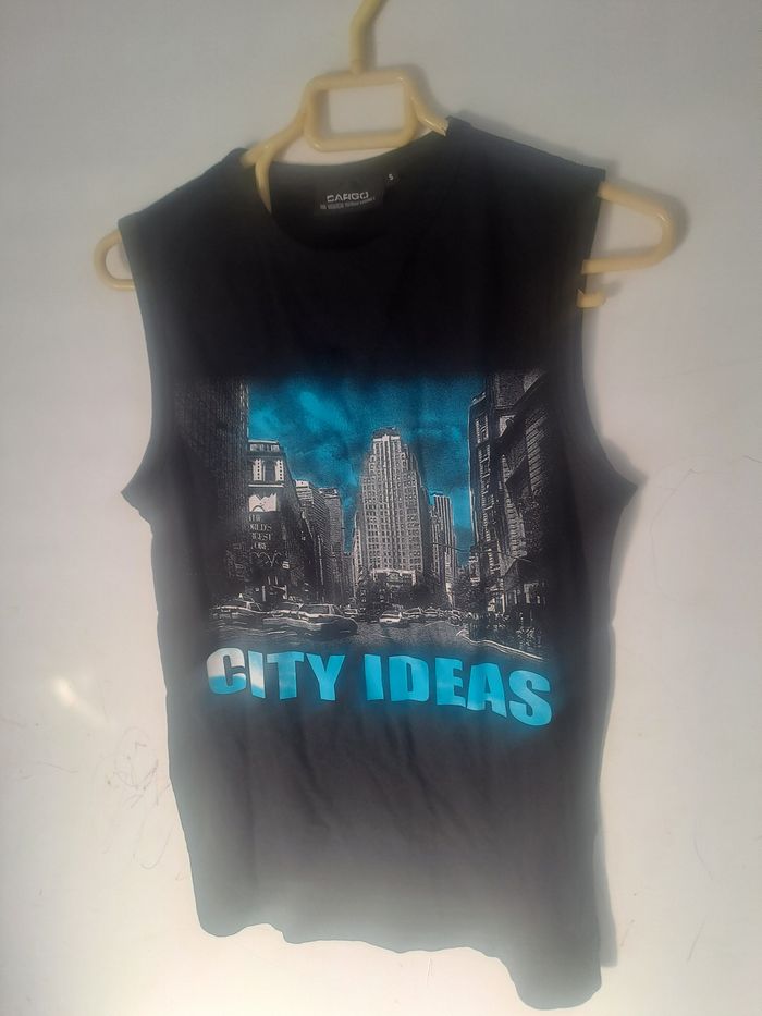 Tee-shirt Marcel Sans manches Col rond Couleur noir avec décor d'une ville bleu et gris, l'arrière est noir uni Inscription City Ideas Taille S Marque Cargo " The Original Vintage Clothes "
