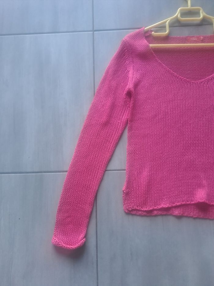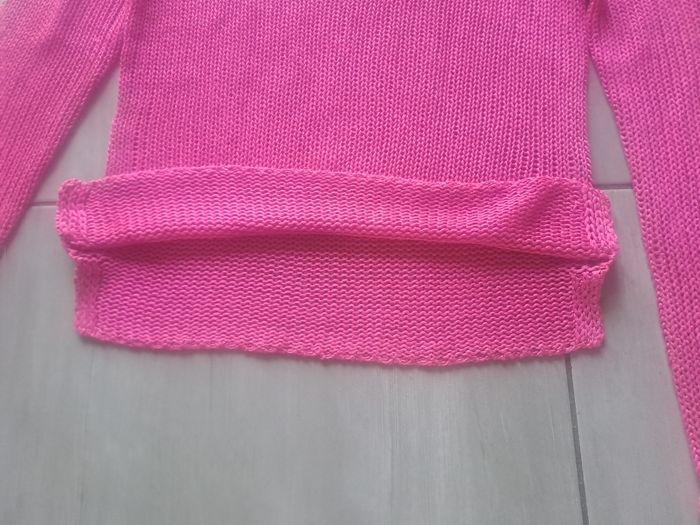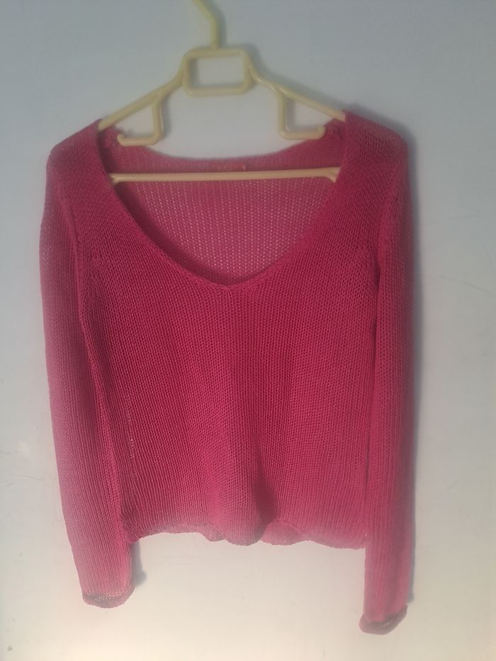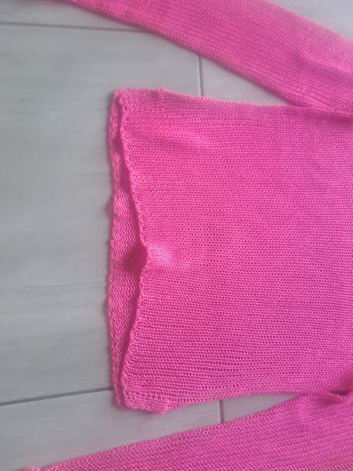 Pull ajouré Manches longues, redoubler au bout Avec décolleté Fentes dans le bas Couleur rose fuschia Taille 38/40 Marque Tissaia