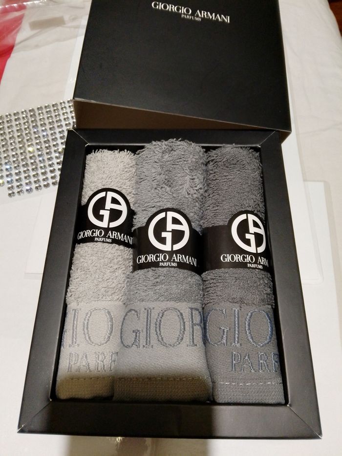 Serviettes invités Giorgio Armani . Neuves dans leurs emballages d' origine. 30x30. Trois serviettes de différents gris.