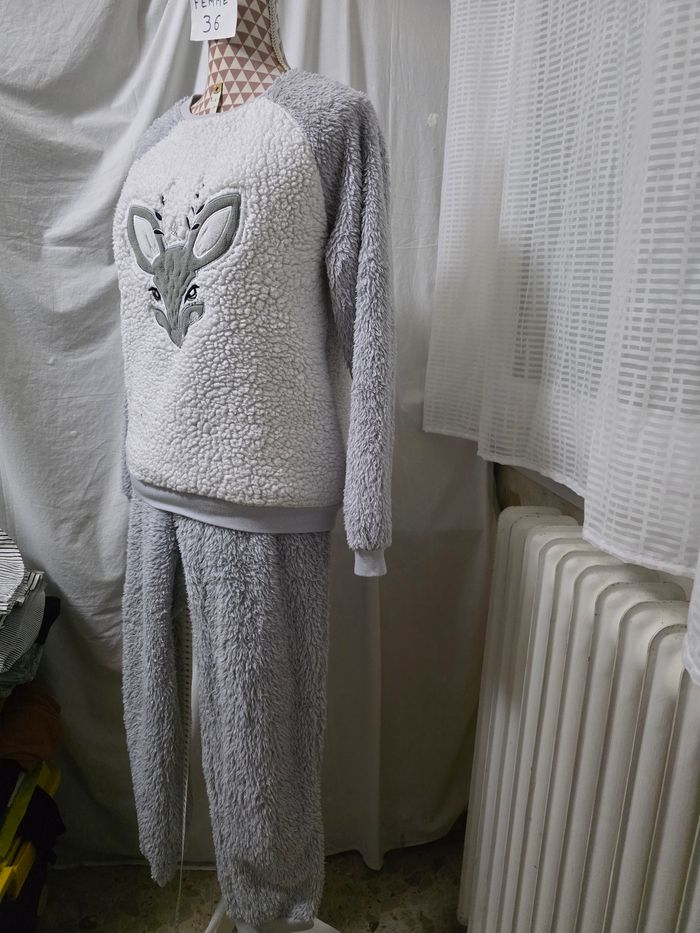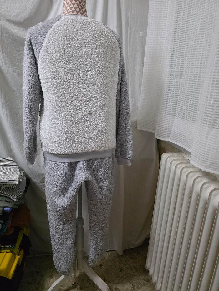 Pyjama,molleton, gris&blanc, en très bon état,très chaud, motif tête de biche, en polyester. Haut= largeur d'épaule 40cm,largeur sous bras 51cm, longueur 59cm.Bas= largeur de taille 35cm élastique, hauteur de taille 35cm, marque La Halle = 9€ - photo numéro 9