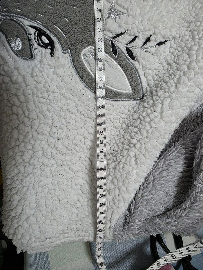 Pyjama,molleton, gris&blanc, en très bon état,très chaud, motif tête de biche, en polyester. Haut= largeur d'épaule 40cm,largeur sous bras 51cm, longueur 59cm.Bas= largeur de taille 35cm élastique, hauteur de taille 35cm, marque La Halle = 9€ - photo numéro 2