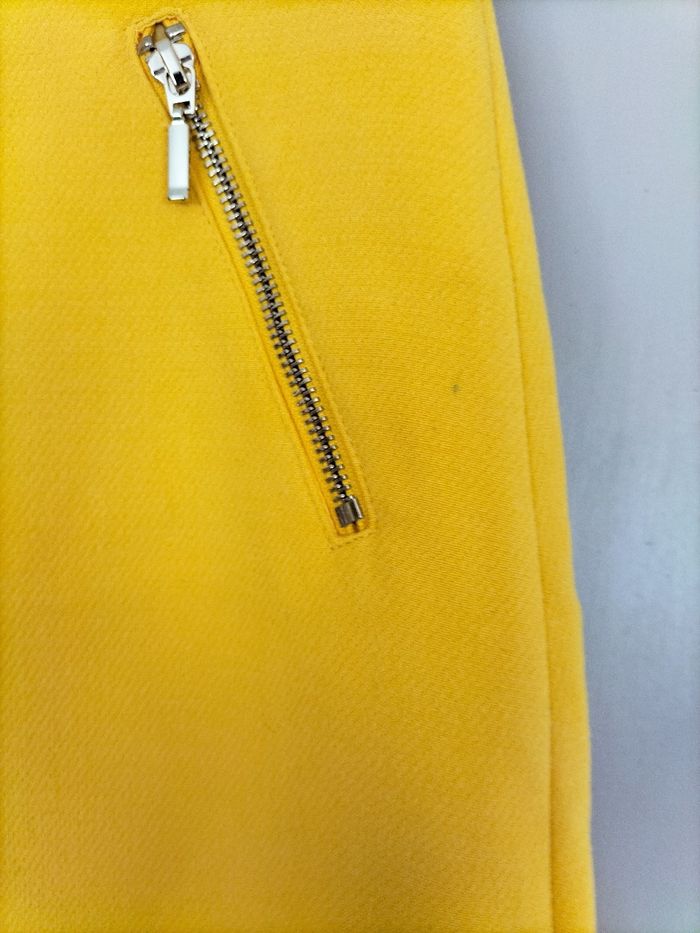Jupe jaune petite tâche incrustée dans le tissu sur la troisième photo 64% polyester 33% viscose 3% elasthanne longueur 41cm taille S