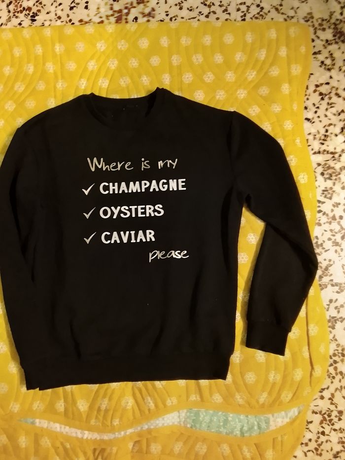 Bonjour, tres beau pull de la marque Jennifer en taille XS en noir a manches longues avec une inscription devant. 100% polyester. En très bon état et sans étiquette : hauteur devant ; 54cm, largeur : 49cm. Hauteur manche ; 53cm, largeur: 15cm.