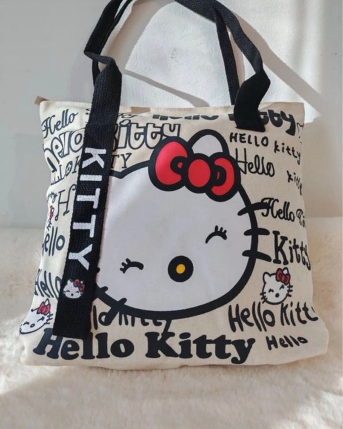 Grand sac fourre-tout Hello Kitty, couleur blanc cassé avec de nombreux motifs et écritures « Hello Kitty ». Design moderne, look mignon et tendance. Deux grandes anses solides noires, confortables à porter à l'épaule. Format spacieux, idéal pour les cours, le shopping ou une utilisation quotidienne. État excellent, très propre. Pratique, léger et résistant. Parfait pour les fans d'Hello Kitty ou pour offrir.