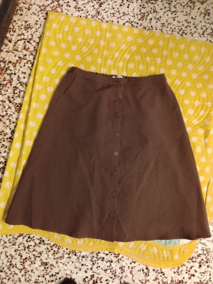 Bonjour, très belle jupe en taille 42 de la marque Charmence . En taupe avec deux poches devant et boutonner devant. 94% polyester , ,5% elasthane . En très bon état et sans étiquette : hauteur devant ; 105cm, largeur: 61cm