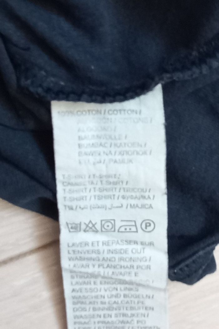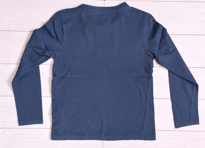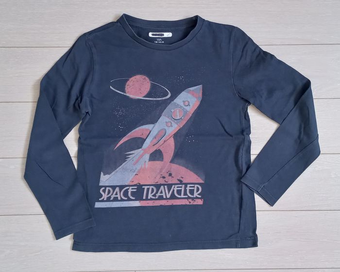 t-shirt manches longues avec impression thème "espace". Étiquette thermocollante à l'intérieur. Petit fil tiré (voir dernière photo)