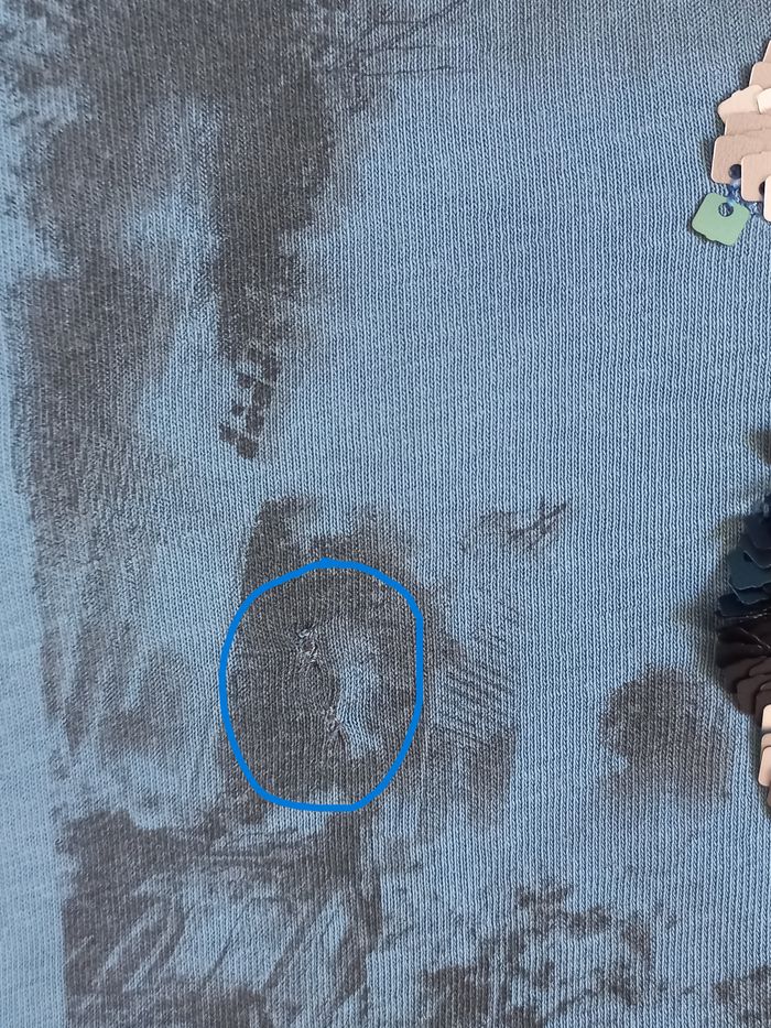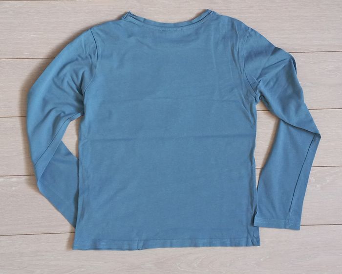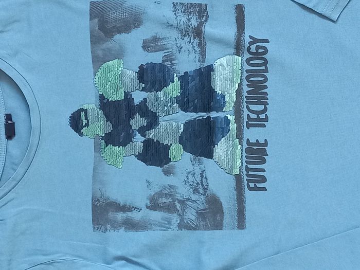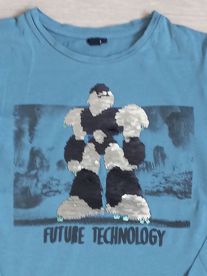 t-shirt à manches longues avec robot en sequins réversibles. A noter : le t-shirt a été reprisé (voir dernière photo) mais le défaut est peu visible et le t-shirt peut encore faire un heureux