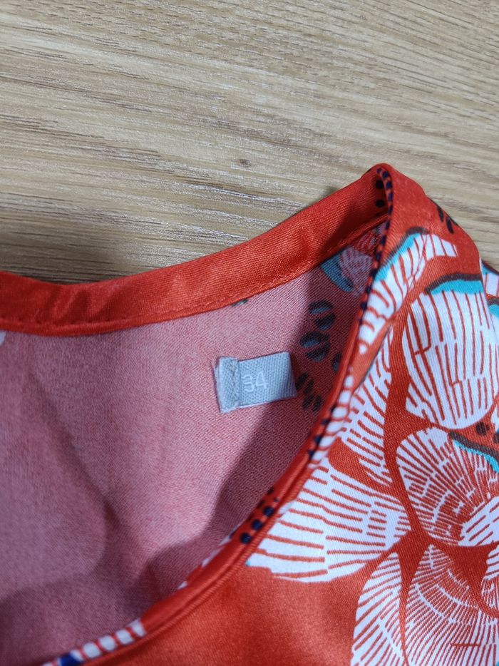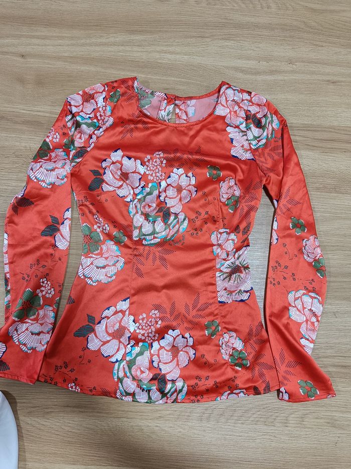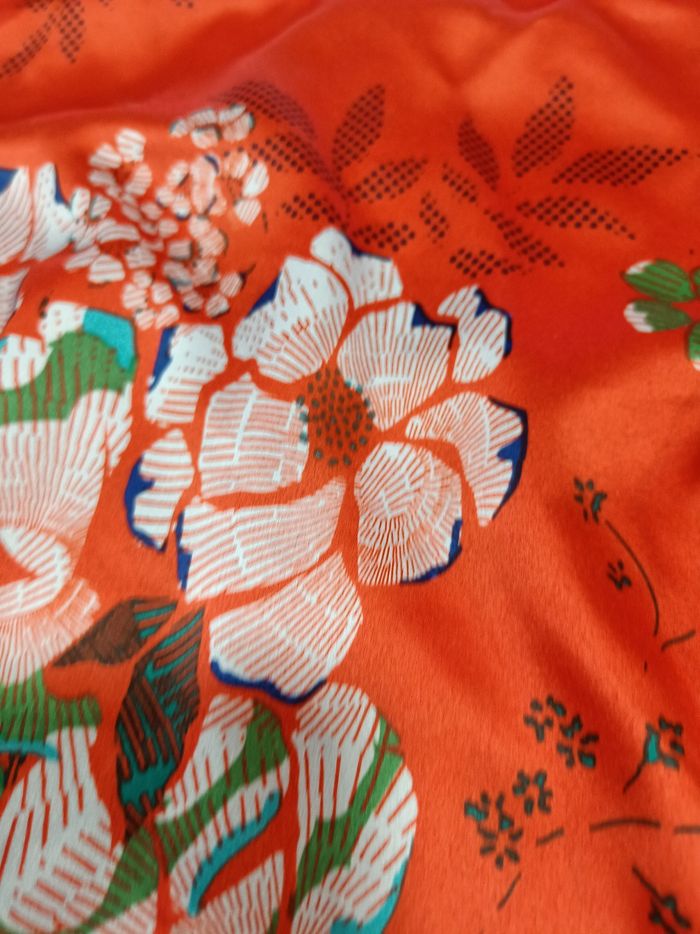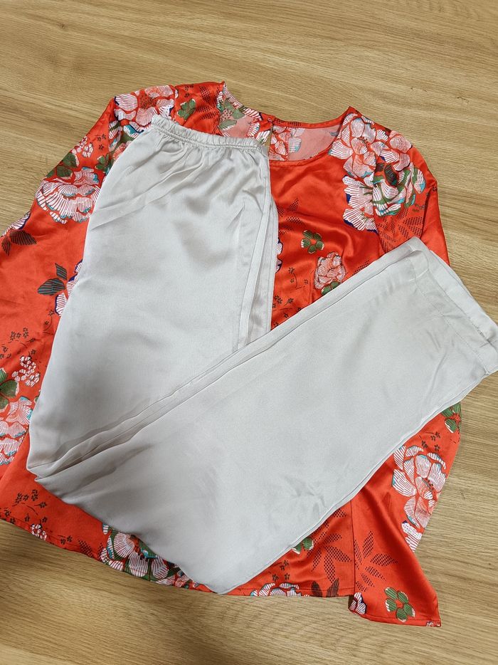 Ensemble fluide,haut manche longue orange fleuri,pantalon long nacre. Peu porté !