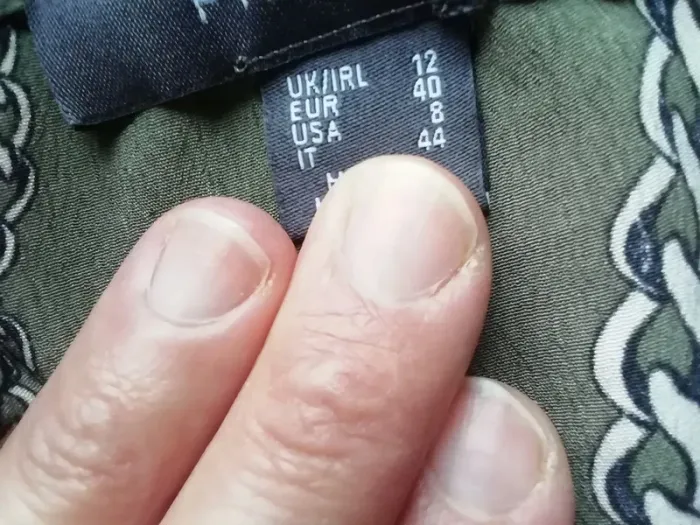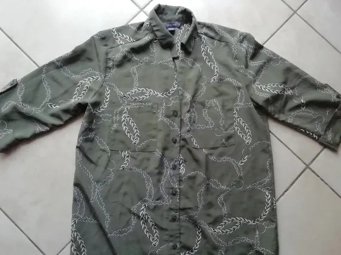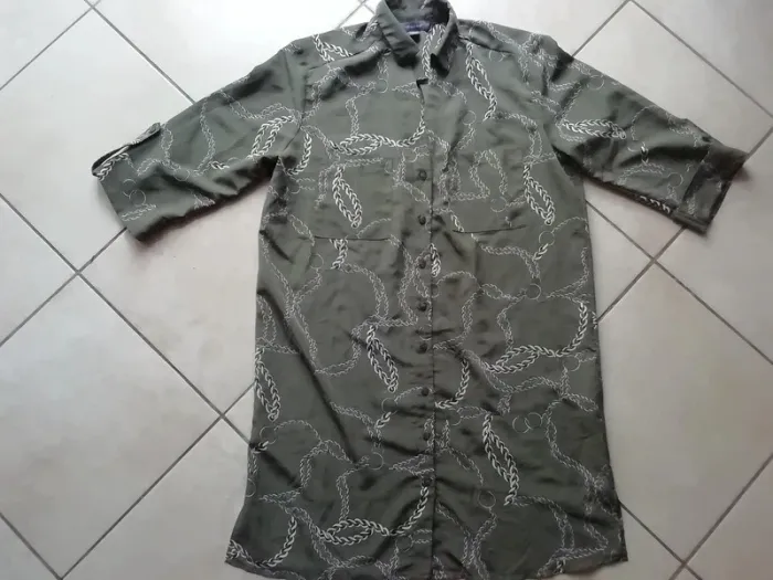 DANS UN TON KAKI. TRES BEAU TISSU FLUIDE. ENTIEREMENT BOUTONNEE. A PORTER EN ROBE COURTE OU EN TUNIQUE LONGUE. MANCHES 3/4. NEUVE JAMAIS PORTEE CAR NOTEE 40, MAIS UN PEU TROP GRANDE, PLTOT 40/42 VOIR PETIT 42, PORTEE DIFFEREMENT; VOIR MENSURATION CI DESSOUS. LONGUEUR : env 88cm. LARGEUR AISSELLE : env 54cm.
