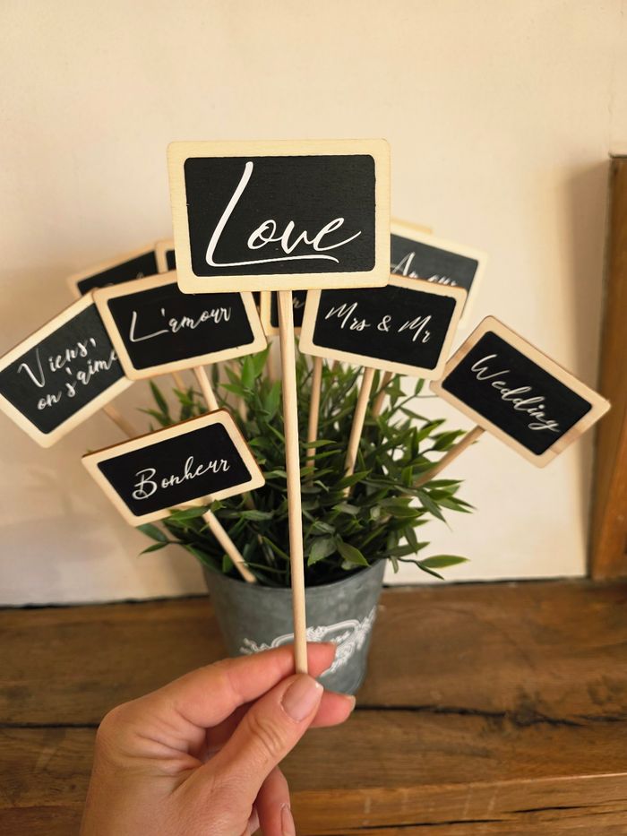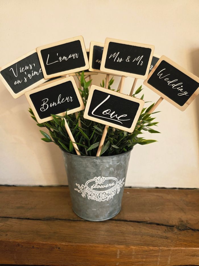 Lot de 12 petites ardoises avec stickers différents pour décoration de mariage. Parfait état ⚠️ Acheteur sérieux uniquement. 📦 Envoi soigné, pesé et filmé
