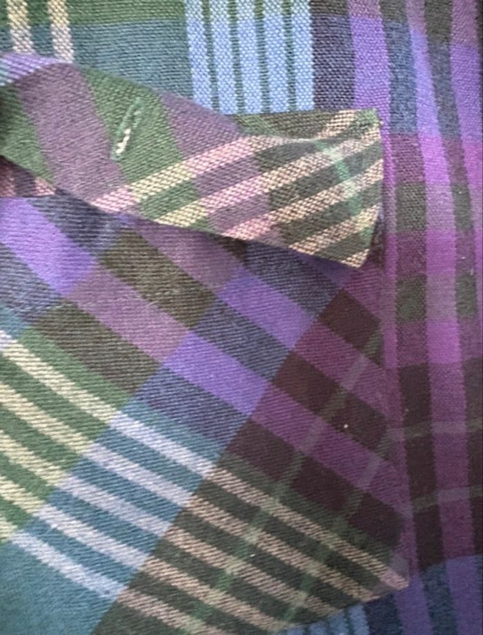 Chemise claybrook outdoors, de couleurs bleu vert et mauve, de taille XL. Il lui manque 3 boutons les deux derniers et celui de la poche droite.