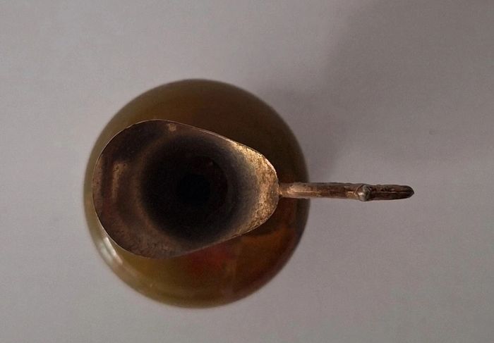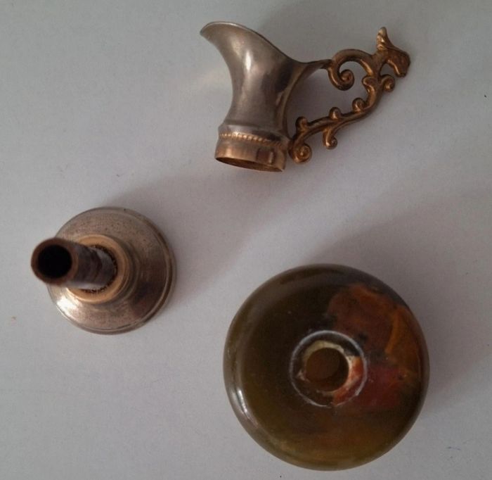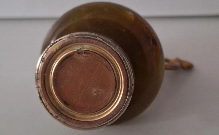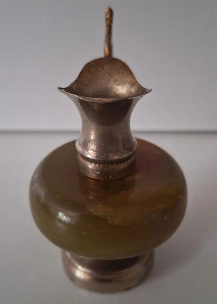 Sorte de petit vase en laiton, avec une pierre ronde au centre. D'après mes recherches ça serait de l'onyx. Il mesure 8 cm et est assez lourd. C'est très ancien. II se démonte en 3 parties.