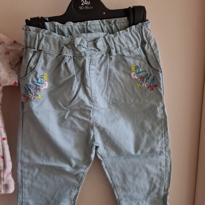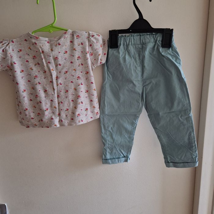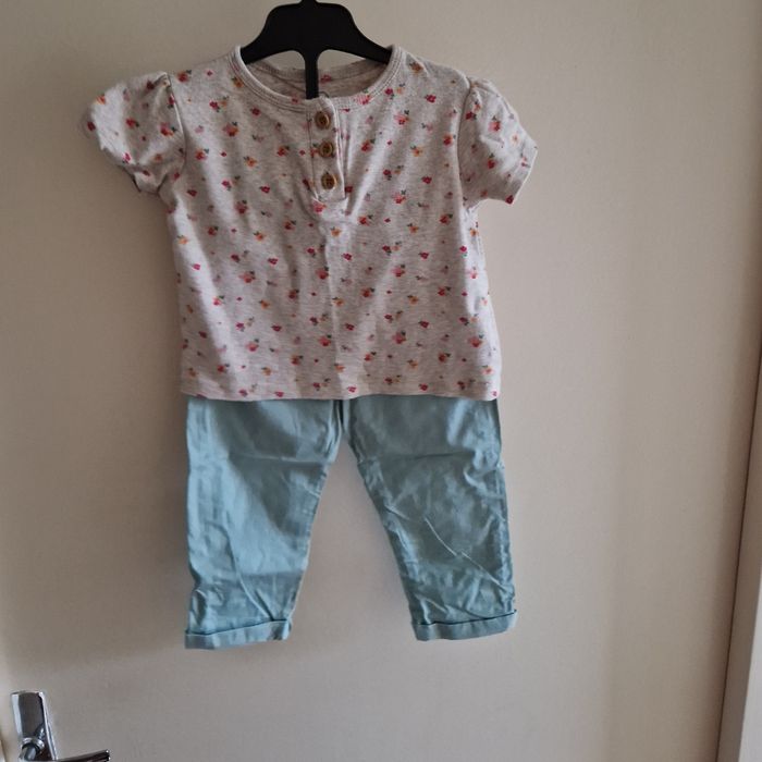 💐Négociation acceptée sur lot💐 Ensemble etat neuf (porté 1 fois) Haut fleuri et pantalon ajustable bleu turquoise Marque mots d enfants Taille 18 mois