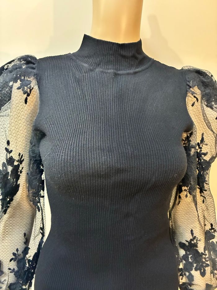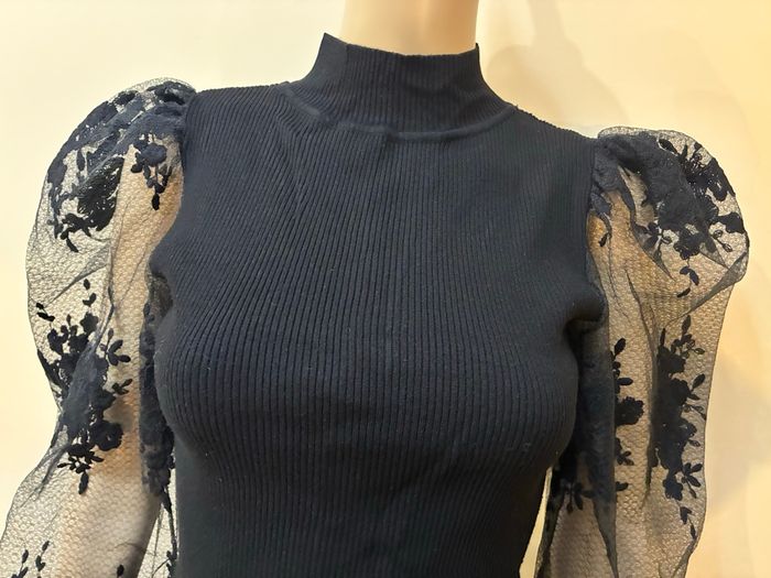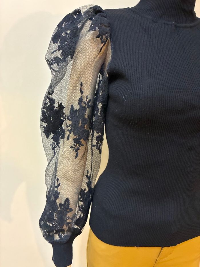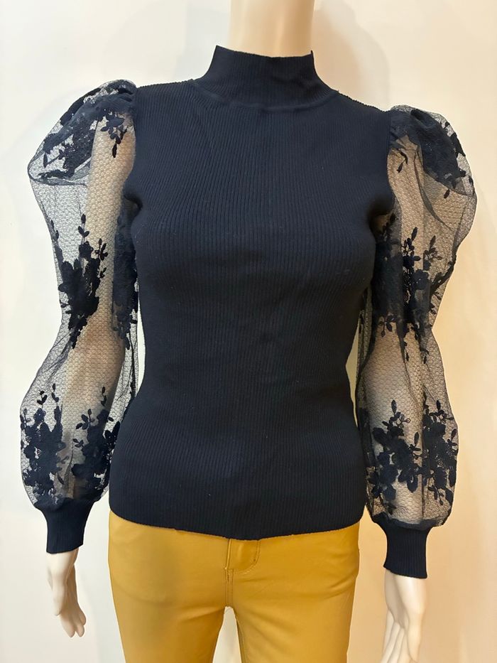 📦 pull léger avec petit col Manches bouffantes / transparentes / motifs fleurs brodés Très joli rendu porté. Taille 34 (étiquette coupée mais taille 34) CACHE-CACHE 🚨remise sur lot activée ✨envoi rapide et soigné