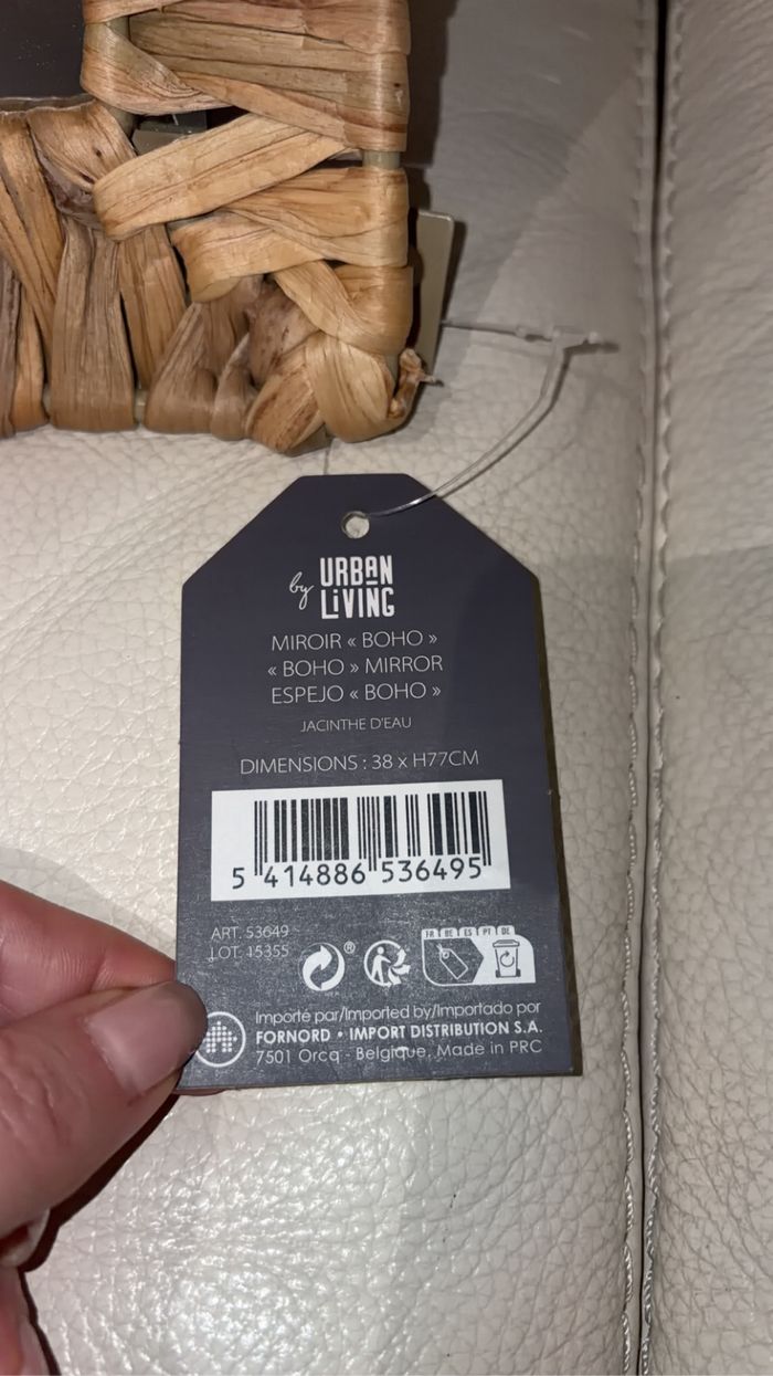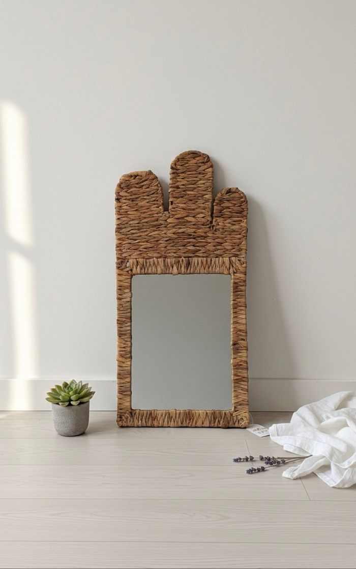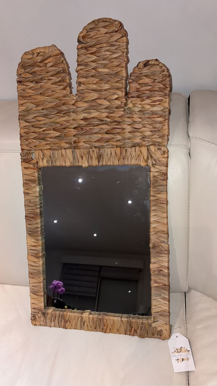 Vends superbe miroir mural au style bohème de la marque Urban Living. Le cadre est entièrement tressé en jacinthe d'eau, apportant une touche naturelle et chaleureuse à votre décoration. Sa forme originale avec ses trois arrondis sur le dessus rappelle l'esthétique "cactus" ou "couronne" très tendance. * État : Neuf avec étiquettes (jamais utilisé / jamais accroché). * Dimensions : 38 cm x 77 cm. * Matière : Jacinthe d'eau (fibre naturelle). * Style : Boho chic, Scandinave, Naturel. Parfait pour une entrée, une chambre ou un salon.