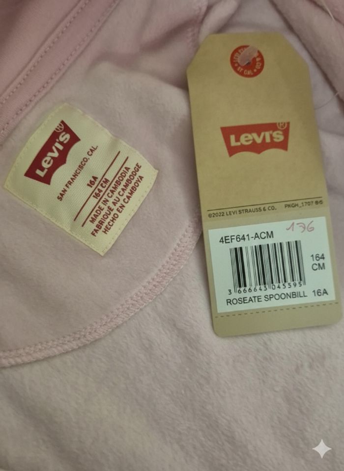 Vends ce magnifique sweat à capuche entièrement zippé de la marque Levi's. Il est neuf avec étiquette, jamais porté. Un basique incontournable, très doux et confortable, parfait pour la mi-saison ou les soirées fraîches ! ​Marque : Levi's ​Taille : 16 ans (correspond à du 164 cm). Peut aussi convenir à une taille adulte XS/S (34/36) pour un effet ajusté. ​Couleur : Rose "Roseate Spoonbill" (un très joli rose pâle/pastel). ​Détails : * Logo Levi's brodé sur la poitrine en bleu ciel avec petits détails brillants. ​Fermeture éclair sur toute la longueur. ​Matière molletonnée douce à l'intérieur. ​Produit authentique (étiquettes présentes). ​État : Neuf avec étiquette 🏷️