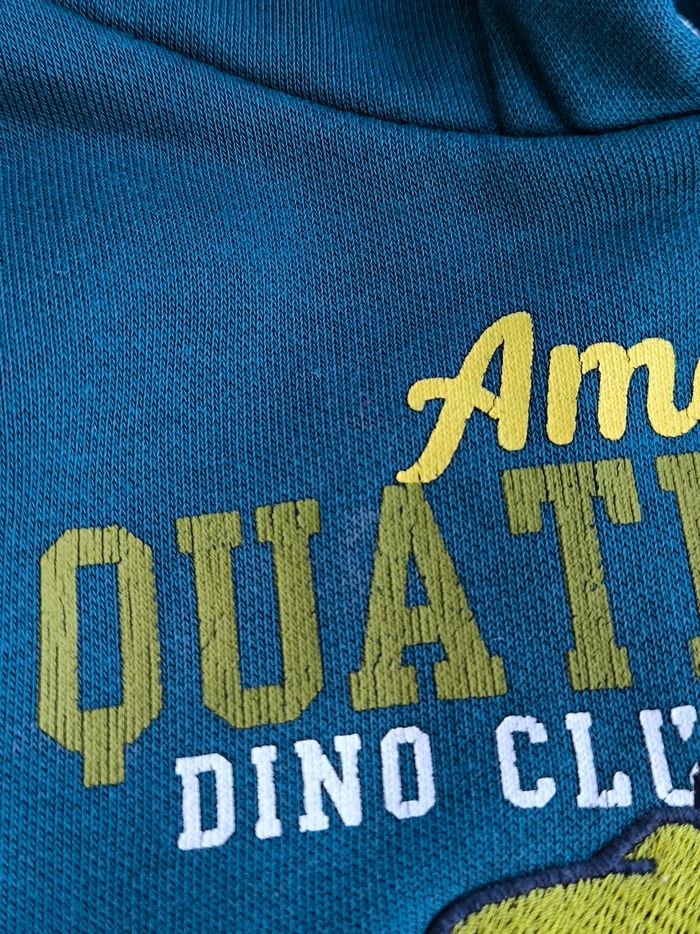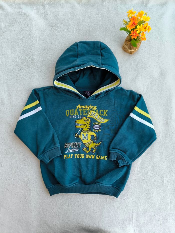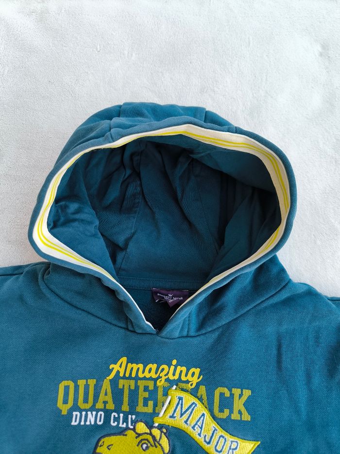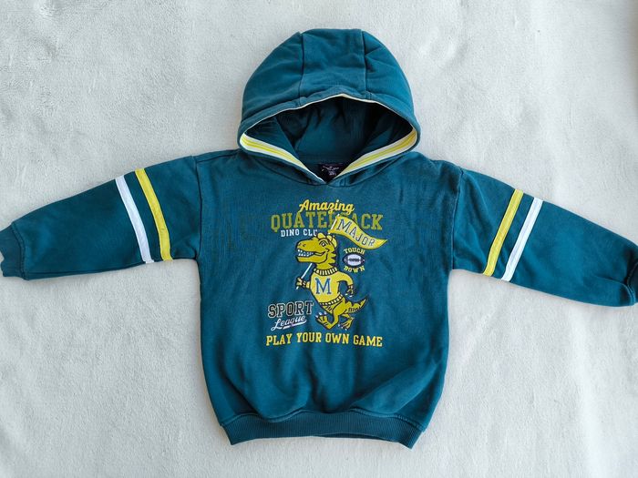 Pull / Sweat à capuche et à manches longues Marque Sergent Major Taille 6 ans, 116 cm • Coloris bleu canard, vert, blanc • Thème football américain, inscription "Amazing quaterback dino club sport league play your own game", broderie dinosaure • Intérieur molletonné • Inscription craquelée, marque crayon sur une manche Peu porté, en très bon état #evelyne_garcons_6ans #evelyne_garcons