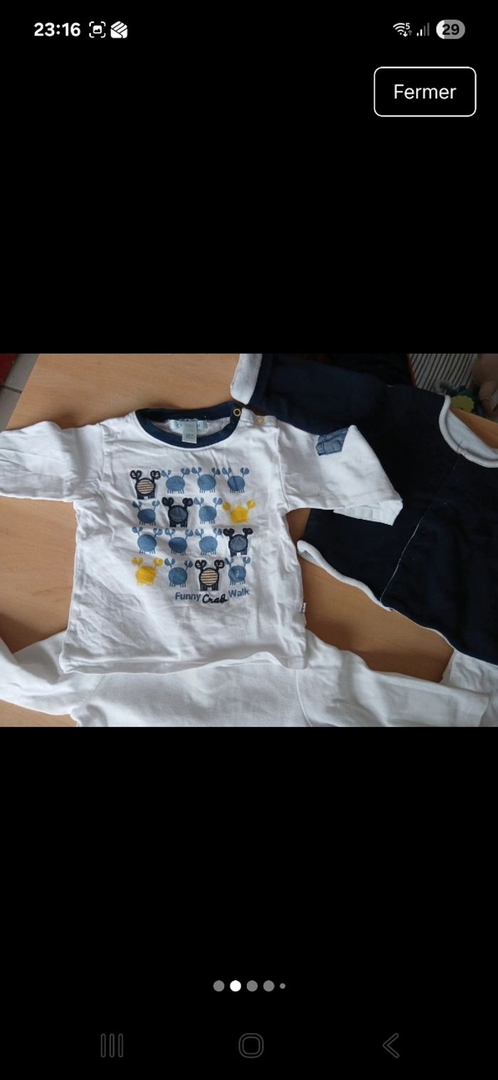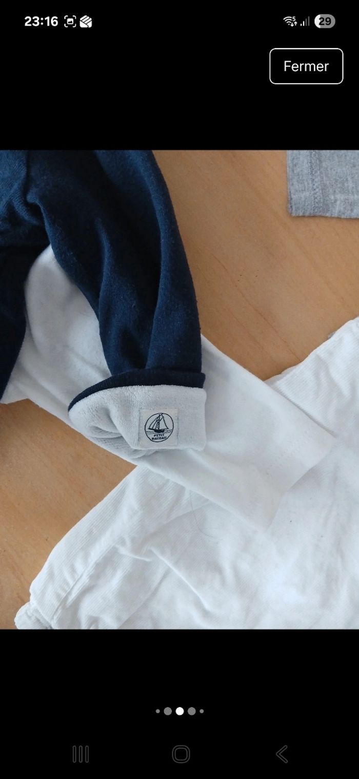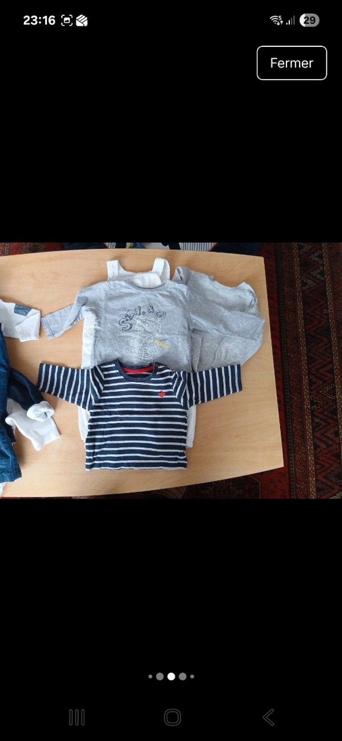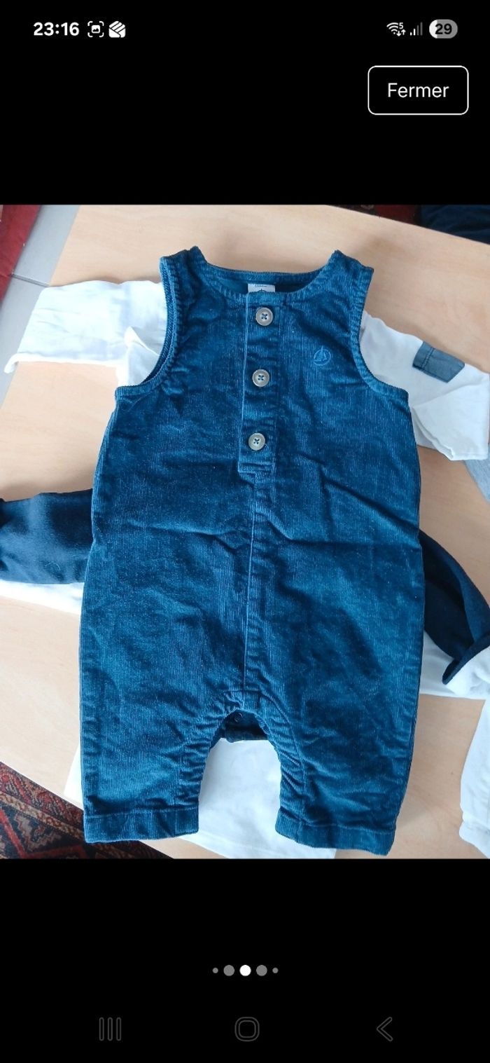 2 salopettes velours (petit bateau, jacadi), tbe 4 t shirts ml (grain de blé, okaidi,...), be 1 pull coton kimbaloo, be 1 gilet petit bateau marine en coton intérieur blanc type velours ras à pressions, be 6 mois