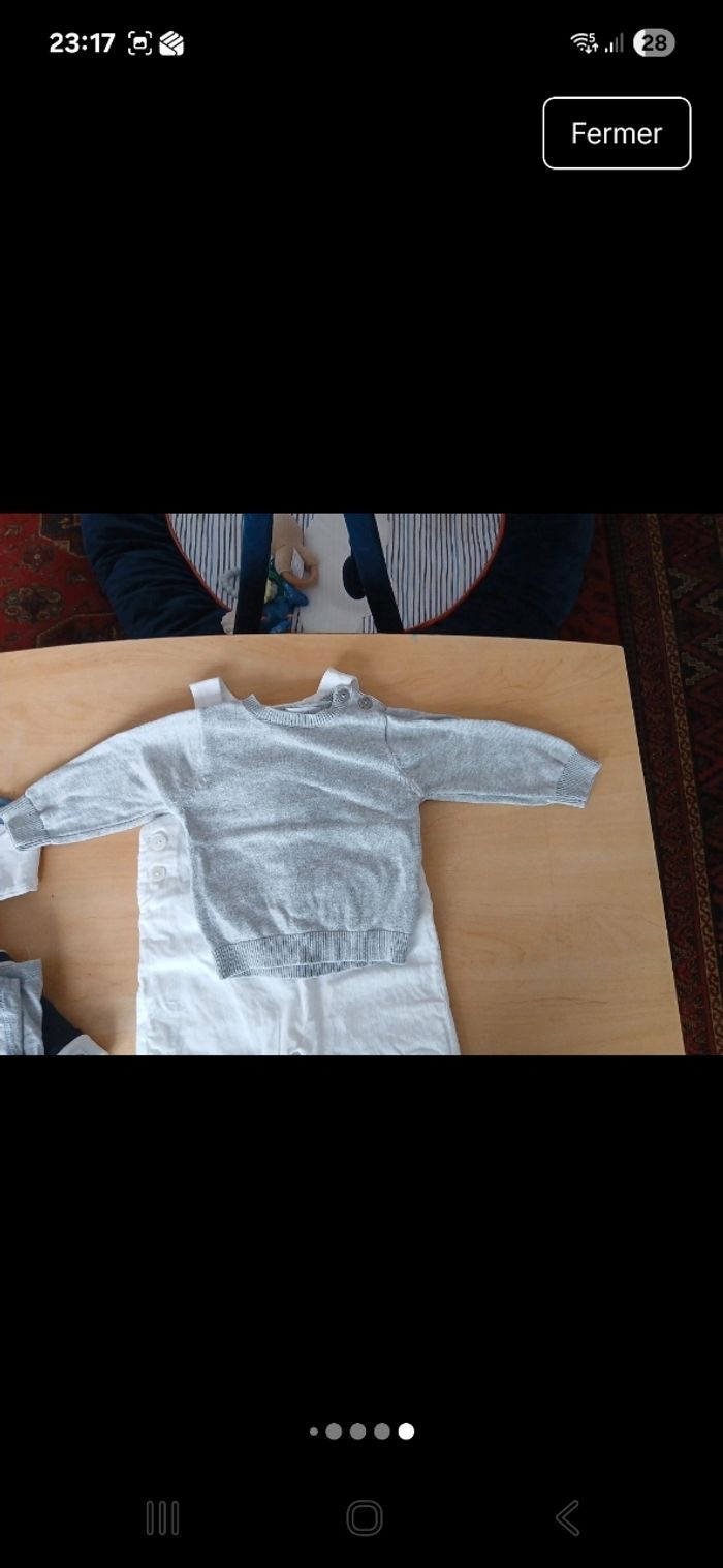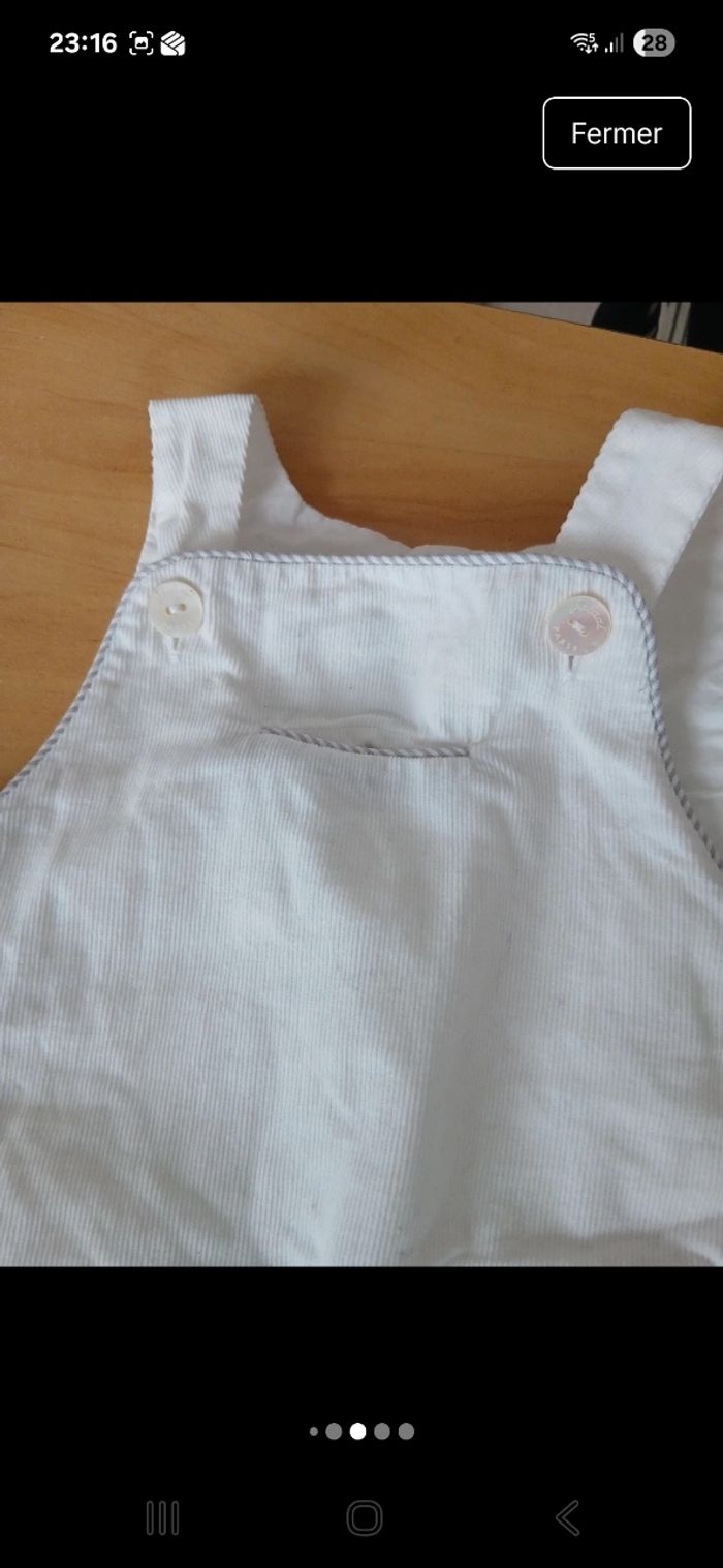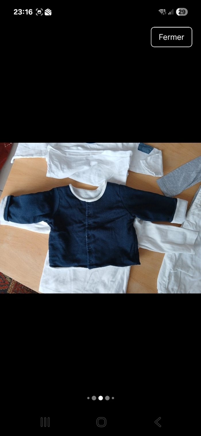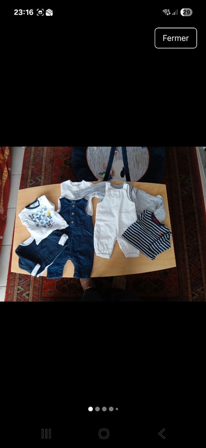 2 salopettes velours (petit bateau, jacadi), tbe 4 t shirts ml (grain de blé, okaidi,...), be 1 pull coton kimbaloo, be 1 gilet petit bateau marine en coton intérieur blanc type velours ras à pressions, be 6 mois