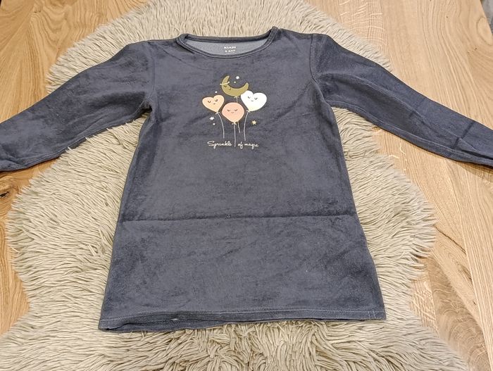 Pyjama 2 pièces gris anthracite Haut long, velours ballons cœur étoile... Bas coton (raccommodé au niveau d'un genoux) motifs étoiles Taille 6 ans 114-119cm Porté mais plutôt bon état Kiabi #liibysixans #6ans #pyjama #pyjamafille #kiabi