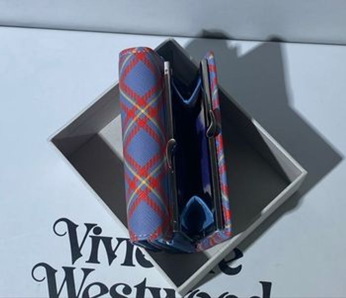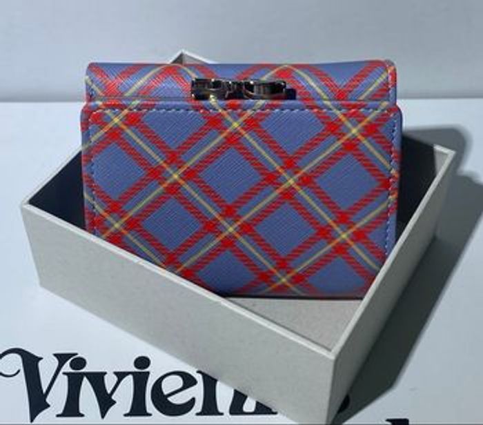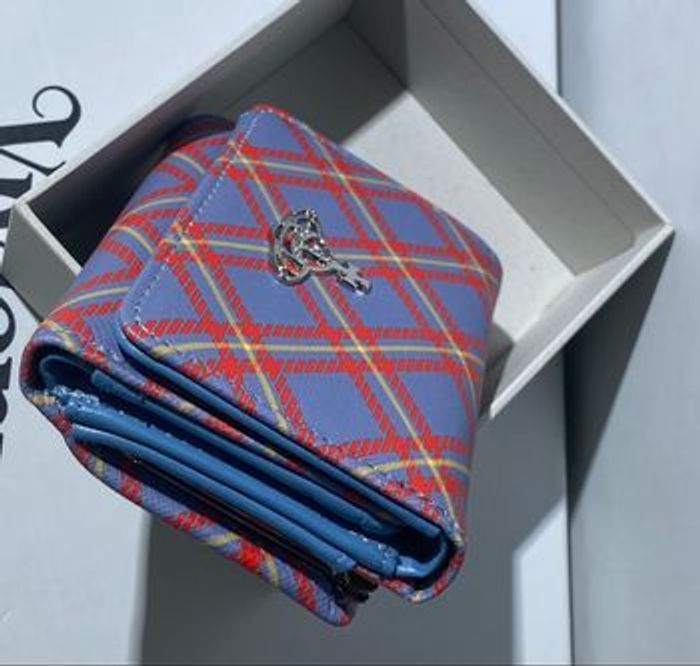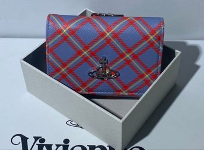 Portefeuille Vivienne Westwood - Modèle Derby Tartan Bleu & Orange Ce portefeuille compact en toile enduite Saffiano arbore un motif écossais vibrant, orné de l'emblématique logo "Orb" en métal argenté. Pratique et élégant, il dispose d'un compartiment sécurisé pour la monnaie et de plusieurs fentes pour cartes, alliant parfaitement l'esthétique punk au luxe fonctionnel. État neuf, présenté dans sa boîte d'origine, c'est l'accessoire idéal pour compléter votre collection ou pour offrir.