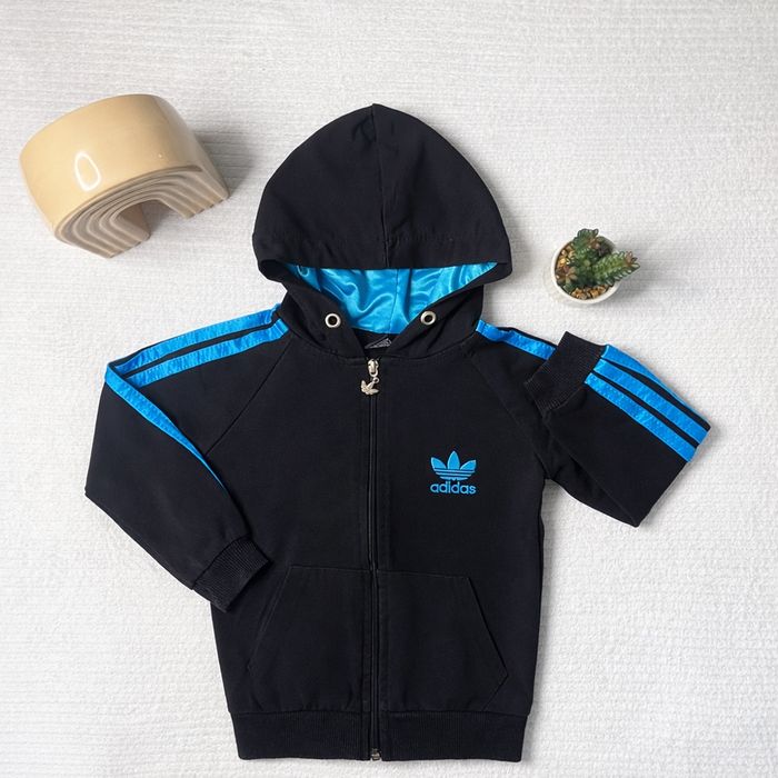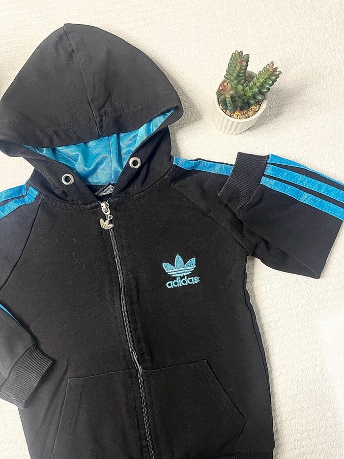 Veste à capuche Adidas taille 3 ans. Excellent état, pas de trou, pas de tâche. Couleur noir et bleu, très facile à assortir. Envoi rapide !