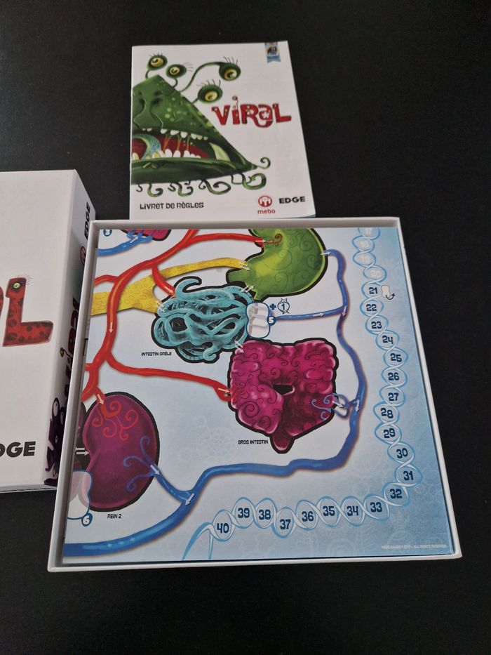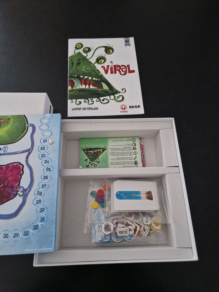 Tout neuf. COMPLET Photos supplémentaires possibles. Règles: vous incarnez des virus qui viennent tout juste d'infecter un Patient. Vous devez désormais vous répandre et muter pour infecter d'autres organes plus vite que les autres Joueurs et gagner des points CONTENU 1 Livret de Règles, 1 Plateau, 5 Plateaux joueur, 40 Tuiles Virus, 8 Tuiles Zone, 4 Tuiles Crise, 1 Marqueur Premier joueur, 1 Marqueur d'Étape, 5 Pions Égalité, 5 Pions Score, 5 Pions Recherche, et 90 Cartes. #viral #jeudesociete #jeudesocieteadulte #jeudesocieteenfant
