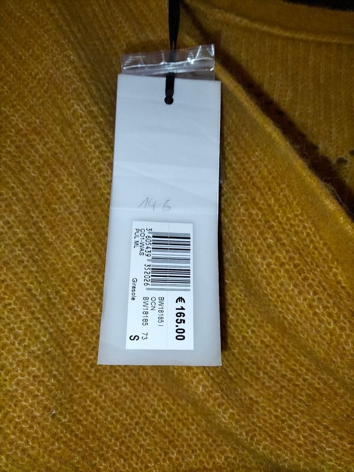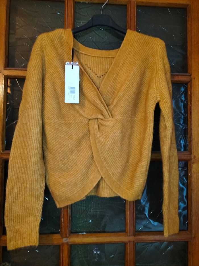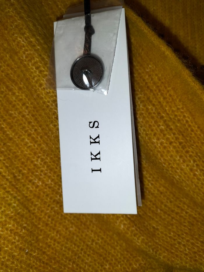 Pull IKKS femme. Couleur moutarde/Orange. On peut le porter recto verso. Neuf avec étiquette . Matière 49% laine/polyamide 32%/ Alpaga 16%/ Elasthane 3%. Taille S 36.