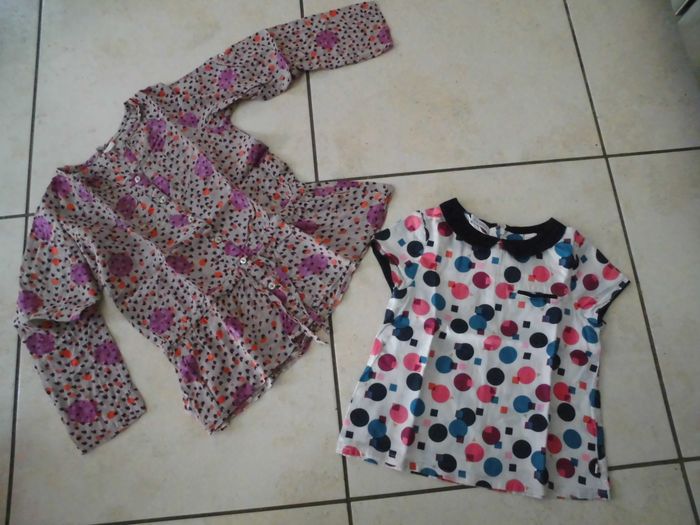 - 1 fond blanc avec motifs cercles et carrés roses/turquoise/bleus, col claudine, manches courtes marque Okaïdi,