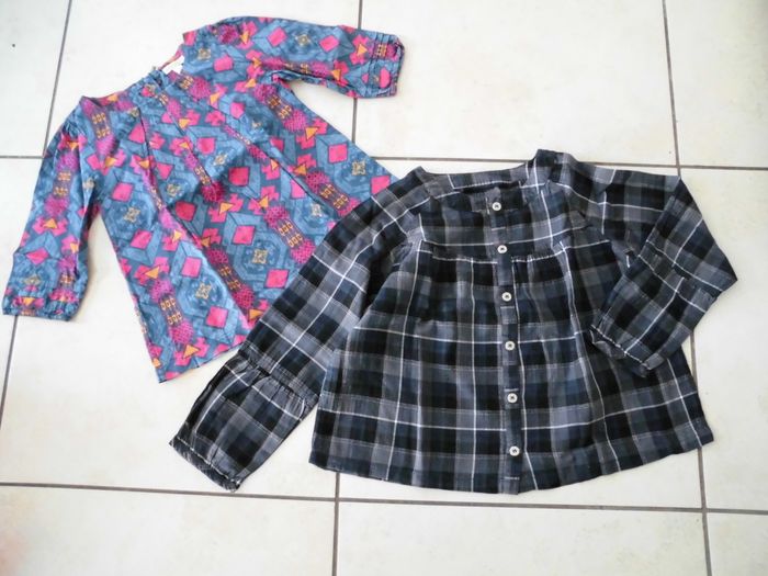 - 1 fond blanc avec motifs violets et vert anis, bouton au col, manches longues, marque Vertbaudet,