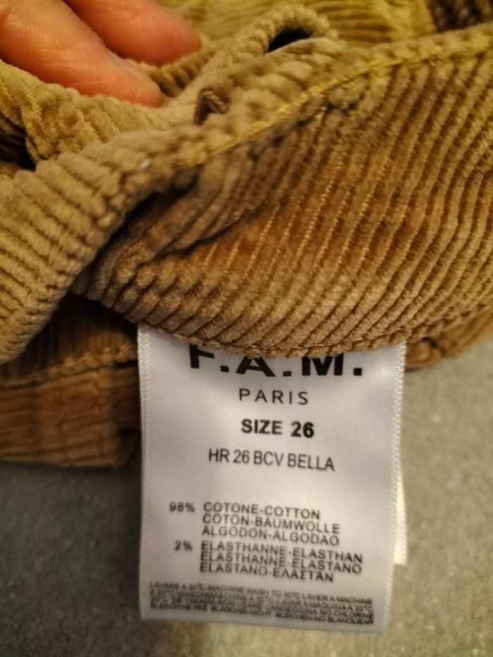 Pantalon velours comme neuf sans étiquette. De marque FAM. Taille 26 qui correspond à un 36 femme.
