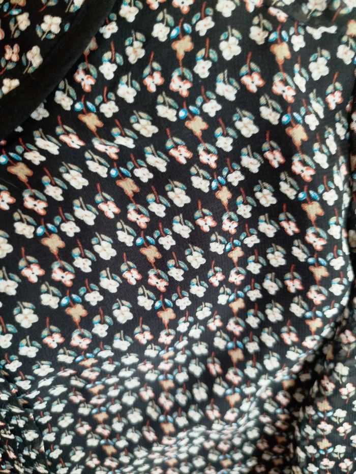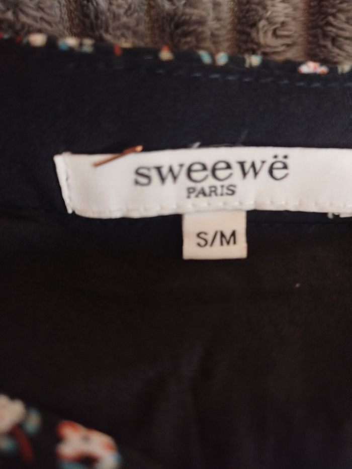 Bonjour magnifique robe porté une fois état Neuf de chez SWEEWE PARIS. Noir avec pleins de petites fleurs de couleur rose et verte pastel, petits boutons doré. Épaule 38 cm. Aisselle 49 cm . Taille élastique à plat 35 cm. Longueur 90 cm. En voilage opaque doublé. Possédant d'autres n'hésitez pas à me suivre Activation sur les lots