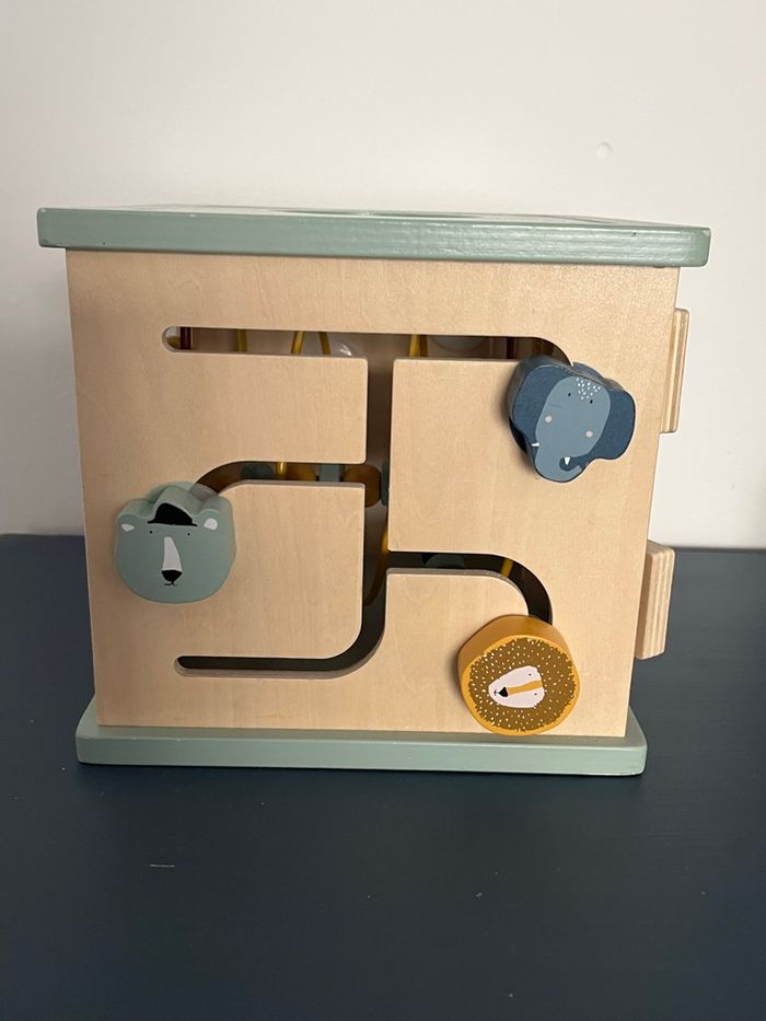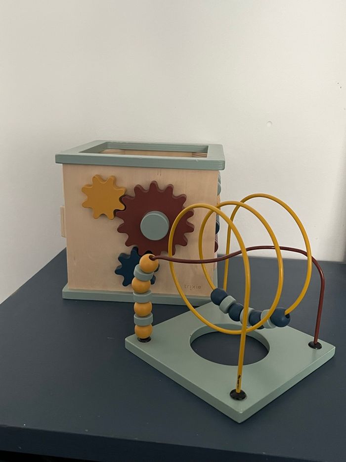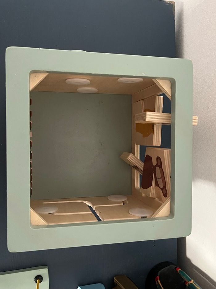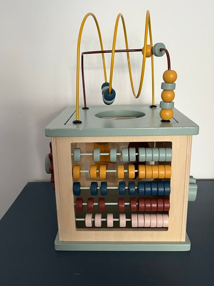 Je vends ce cube d’activités en bois 5-en-1 qui est un jouet éducatif conçu pour les tout-petits à partir d’environ 1 an. Ce joli cube aux couleurs douces est composé de plusieurs activités: - Deux labyrinthes à perles colorées sur le dessus pour manipuler et suivre les chemins. - Un puzzle sur le thème des animaux (associer tête et corps ou imaginer des créatures rigolotes). - Un boulier pour compter et jouer avec les chiffres. - Des engrenages à faire tourner et découvrir les mouvements. - Une face supérieure qui se retourne pour ranger facilement le cube. Dimensions : 23,5 x 21 x 35 cm Matière : Bois de hêtre