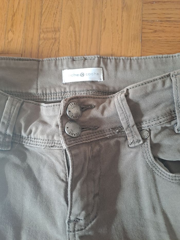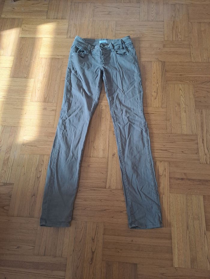 Pantalon stretch de coloris kaki, fermeture par boutons et zip. Très bon état