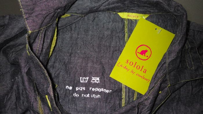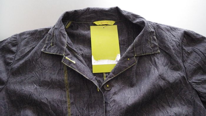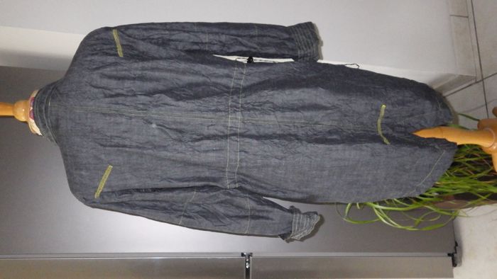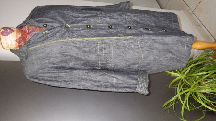 veste longue en jean denim gris foncé souple, tissu effet froissé, surpiqures vert anis, beaux boutons métalliques, froncée à la taille (réglable à ce niveau), deux poches devant, coupe très sympa comme toujours dans cette belle marque ! Carrure 43cm, aisselles 56cm, longueur 87cm. Visitez mon dressing il y a plein d'autres beaux modèles en vente dans tous les styles, toutes les tailles et pour tous les budgets, je vide les armoires il y a de nouveaux arrivages tous les jours ! Abonnez vous à mon profil pour recevoir mes nouveautés en priorité !