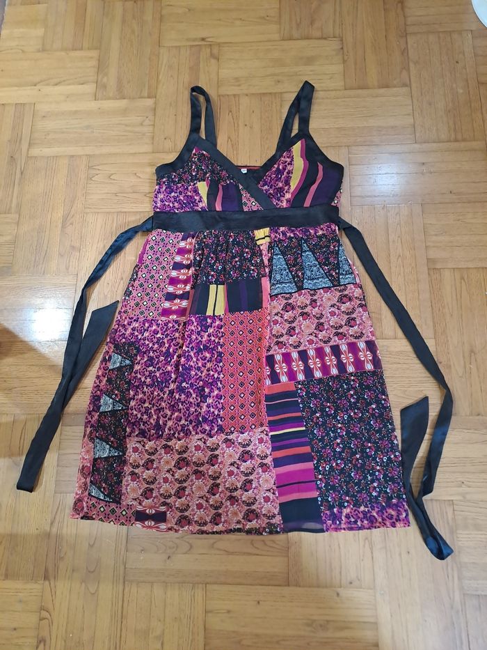 Robe doublée à bretelles de coloris multicolore avec ceinture fixe. Etat neuf.