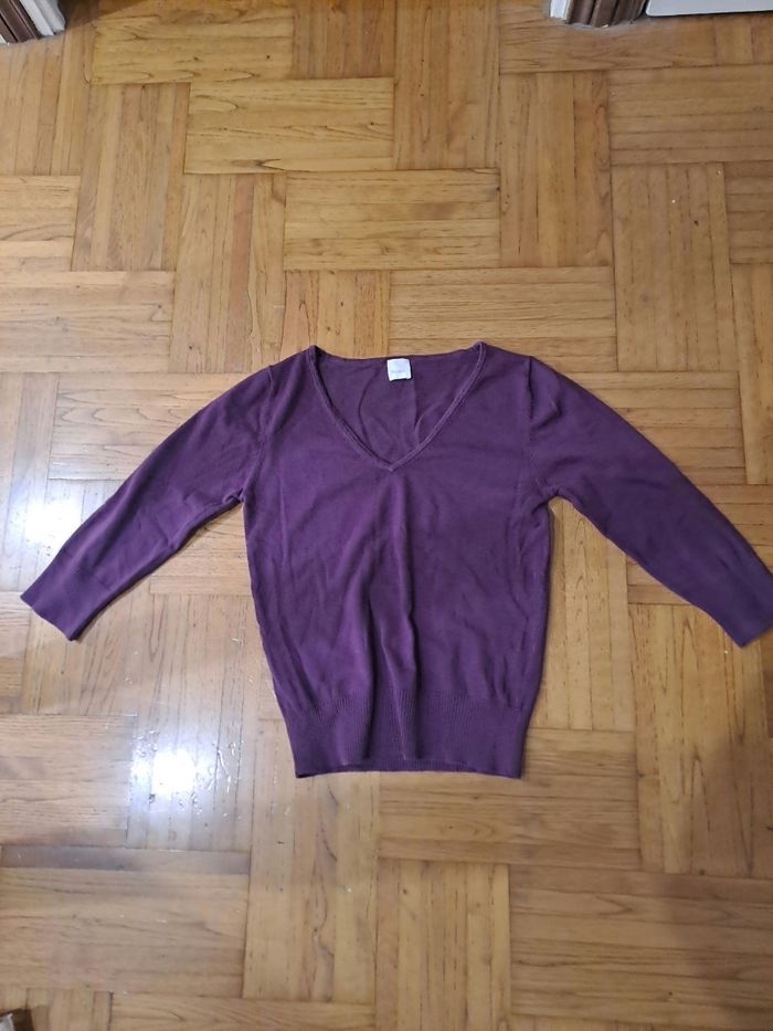 Pull col V de coloris violet , manches 3/4 camavec petits boutons fantaisies aux poignets. Très bon état