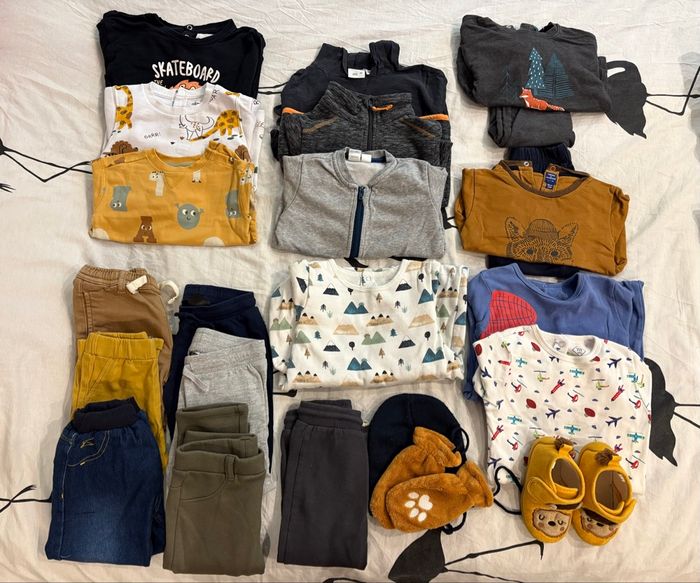 Parfait état - comme neuf Aucunes taches ni bouloches 23 pièces - diverses marques 3 pull 1 pull léger à capuche 1 polaire 1 petite veste de survêtement 7 pantalons 1 bonnet + des moufles en velours 1 pyjama en coton très épais 2 pyjama en coton épais 1 ensemble de survêtement pull/pantalon Terre de Marins 1 ensemble de survêtement pull/pantalon Lupilu 1 paire de chaussons pointure 23