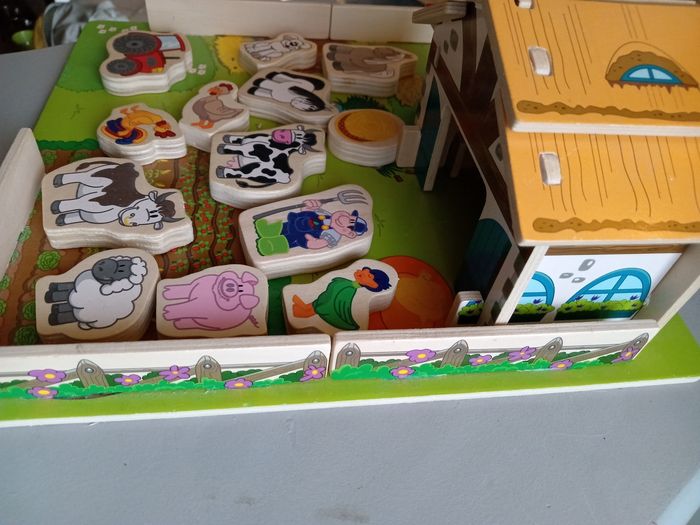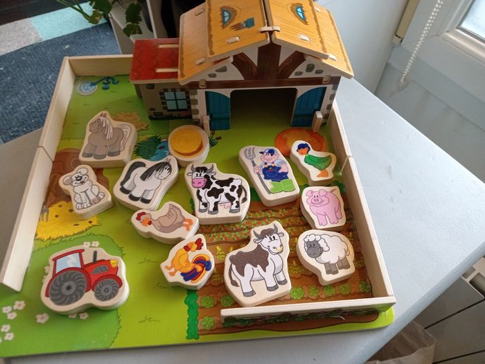 Mini ferme en bois avec des animaux et personnages en 3D. Très bon état. Possibilité de faire des lots pour bénéficier des réductions 😊