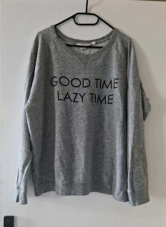Pull gris doux et confortable avec l’inscription “Good Time Lazy Time” sur le devant 🩶 Parfait pour les journées cocooning ou un look décontracté. Matière agréable, coupe unisexe. Taille L, en très bon état. 👉 À porter avec un jean ou un legging pour un style chill et tendance !
