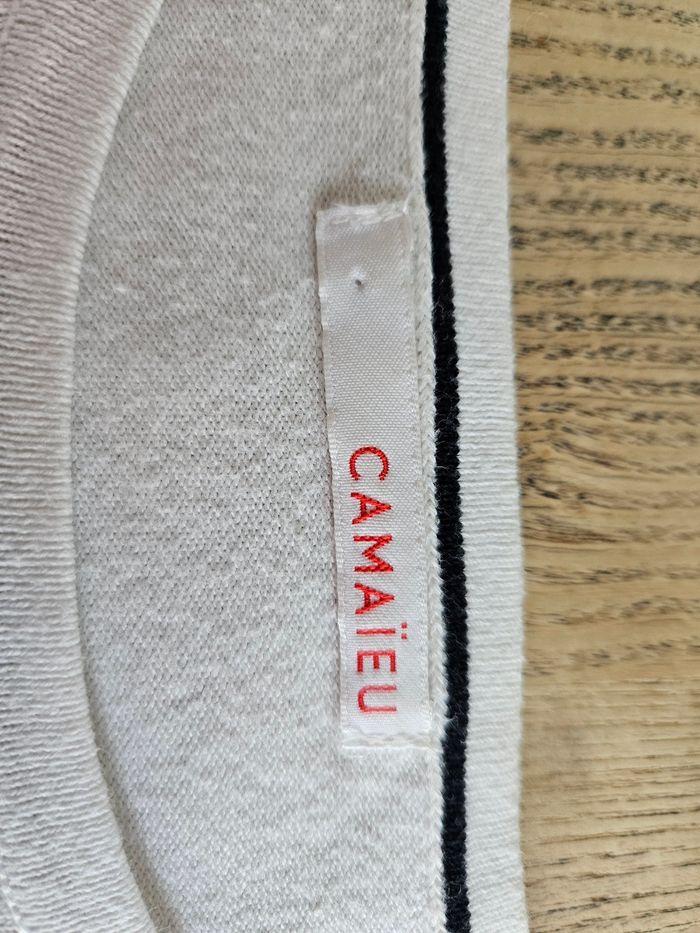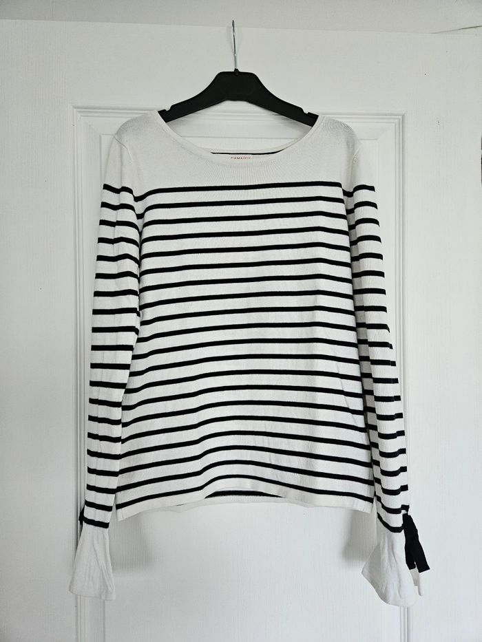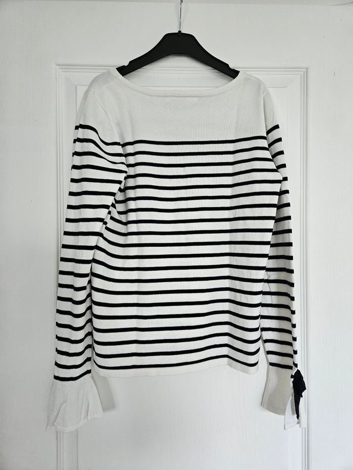 Joli petit pull style marinière avec détails petits noeuds aux bas des manches. Idéal mi saison. Étiquette taille coupée mais taille S. En très bon état. Marque Camaieu.