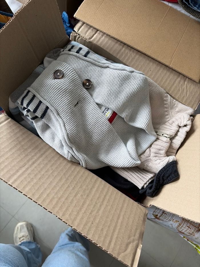 Je vend un carton de vêtement garçon 18 mois Il y a 6 gilets, 1 body, 3 chemises, 2 t-shirt manches courtes, 1 manches longues, 1 ensemble, 1 casquette, 1 veste, 1 salopette, 1 gros gilet polaire, 1 manteau et 1 doudoune sans manches
