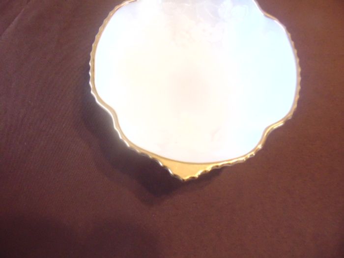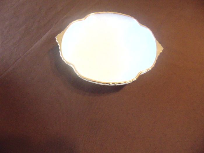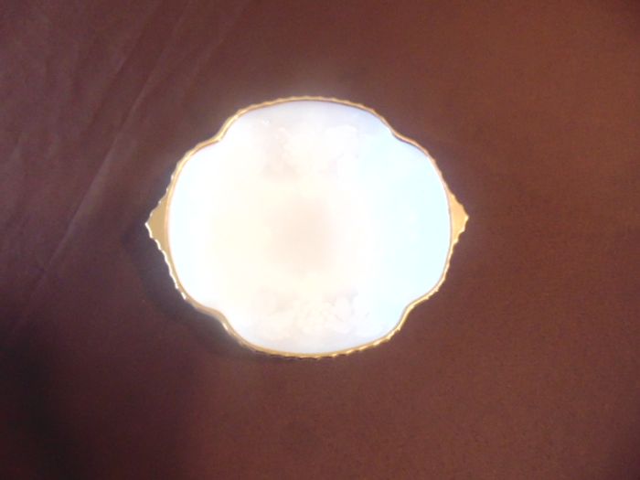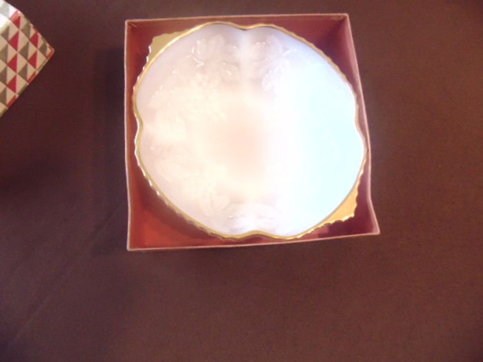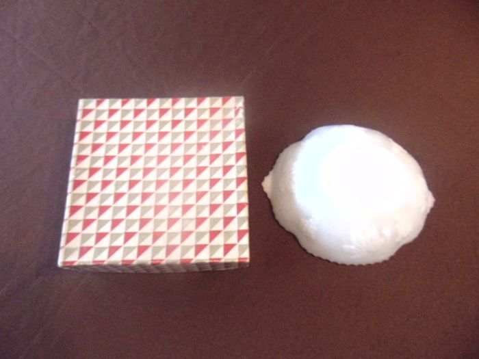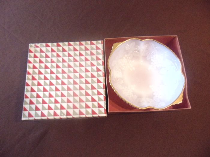 Superbe coupe décorative en verre opalin blanc (“milk glass”) avec bord doré, produite par Anchor Hocking à Lancaster, Ohio (USA). Pièce vintage rare, accompagnée de sa boîte d’origine portant le marquage “Another fine Anchor Hocking product – W-658/G-13”. ✨ Caractéristiques • Marque / Manufacture : Anchor Hocking, Lancaster Ohio, USA • Époque : années 1950–1970 • Matériau : verre opalin blanc (milk glass) • Décor : dorure parfaite, appliquée à la main • Dimensions : hauteur 7 cm, longueur 26 cm, largeur 21 cm • État : excellent, verre intact, dorure sans usure, boîte d’origine conservée