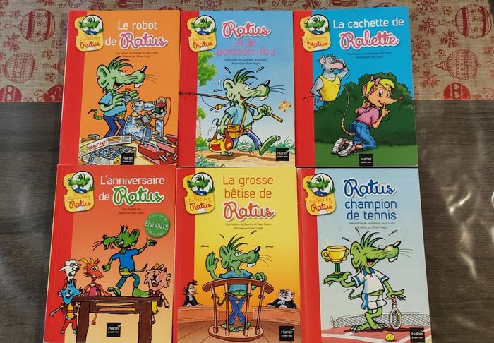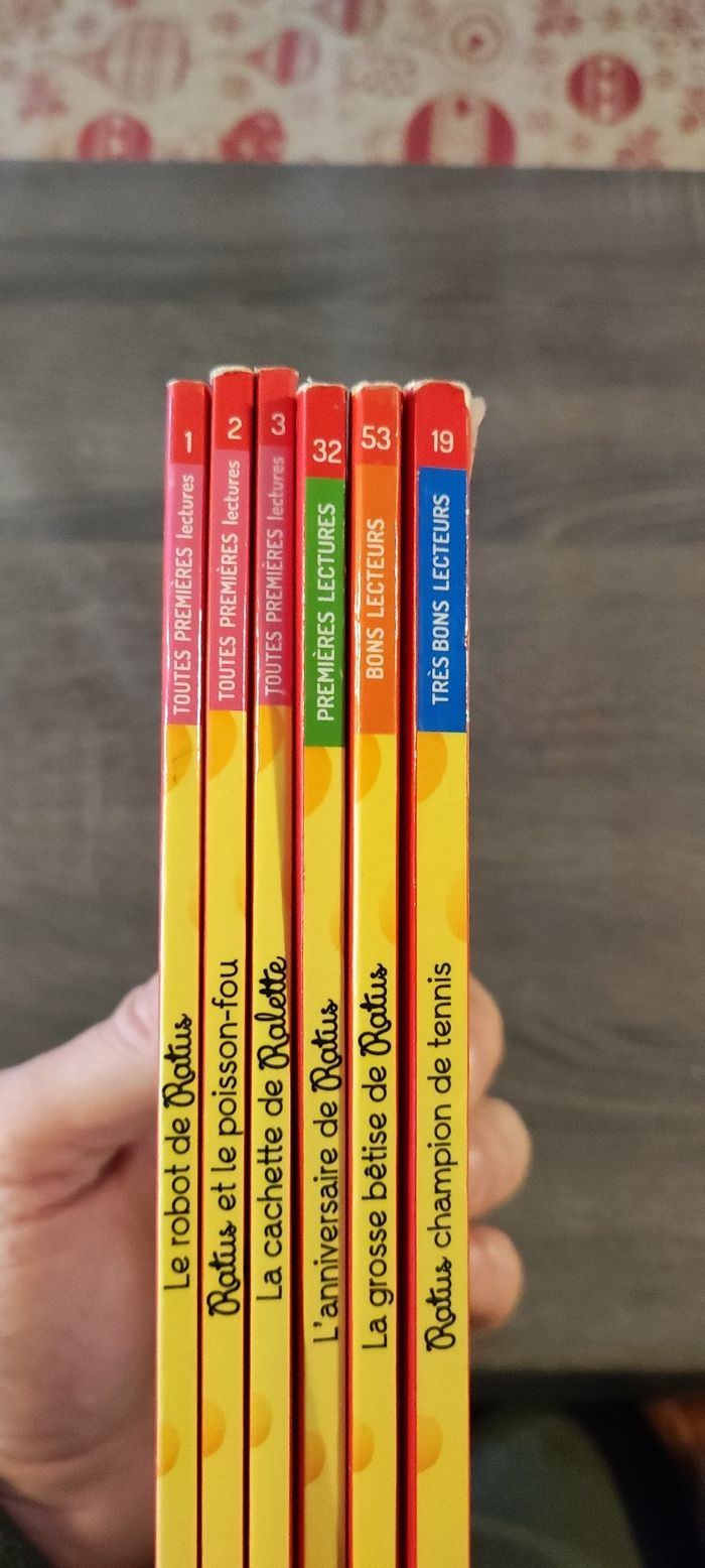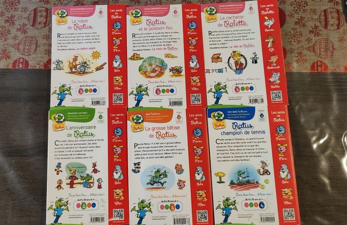 Bonjour. Voici 6 livres de lecture Ratus selon niveau de lecture de l'enfant. Il y a les numéros 1,2 et 3 qui correspondent au toutes premières lectures. Il y a le numéro 32 niveau premières lectures. Il y a le numéro 19 niveau très bon lecteurs. Il y a le numéro 53 niveau bon lecteurs. Le lot est à 9€ N'hésitez pas à me contacter pour plus d'informations ou pour plus de photos. A bientôt