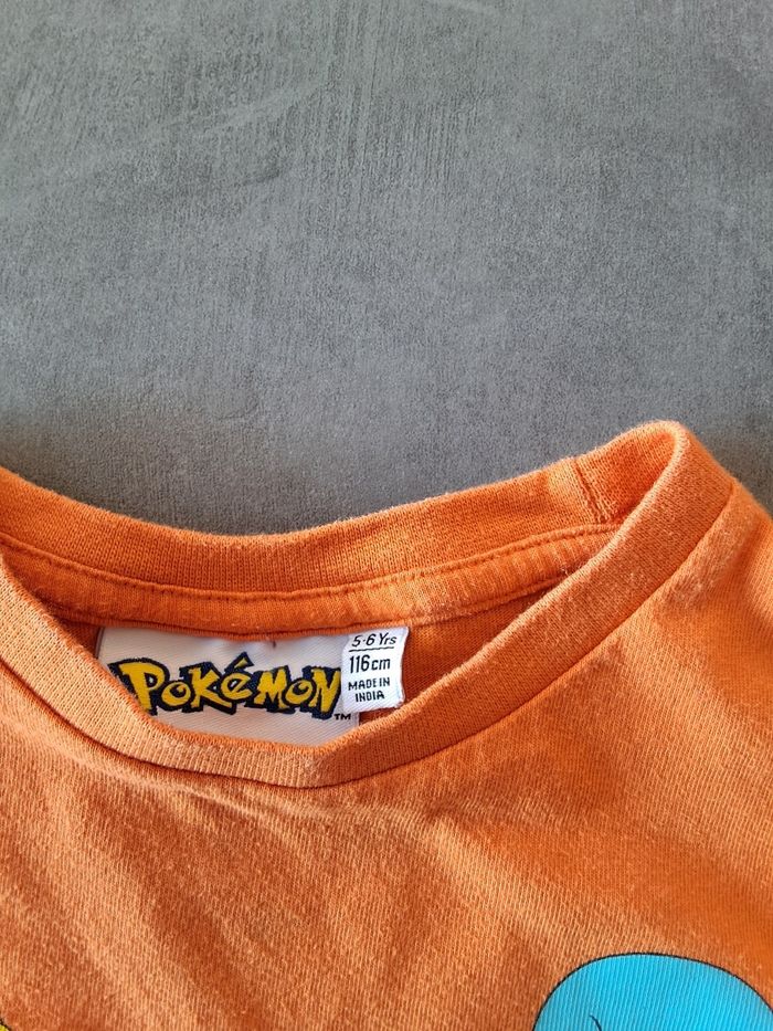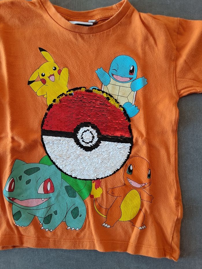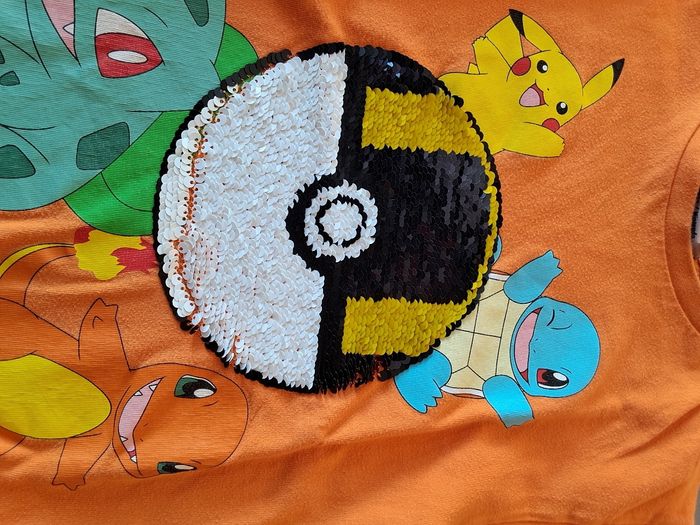 Tee-shirt manches longues orange 5/6 ans Pokemon, parfait état. Les sequins forment 2 motifs différents.