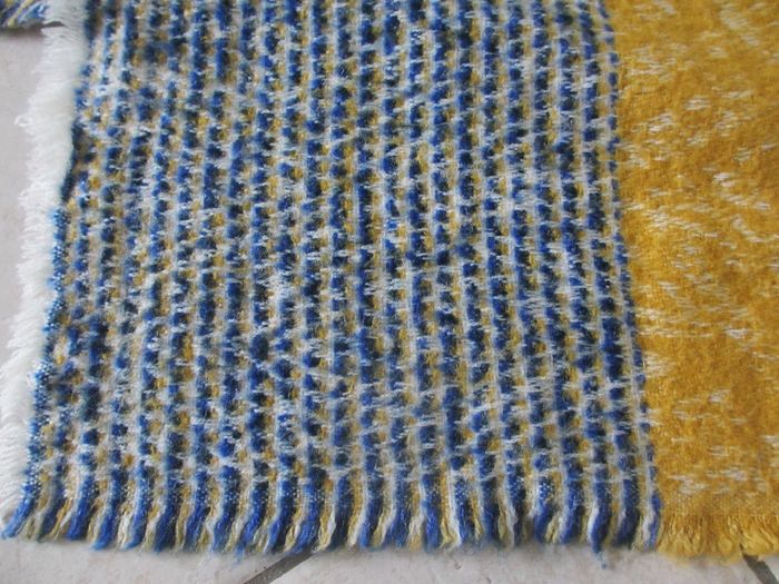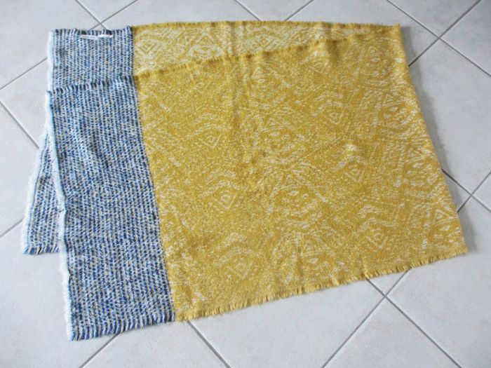 Echarpe couleur moutarde et bleu marine femme Cache Cache Dimensions : 188 x 64 cm. Très bon état.