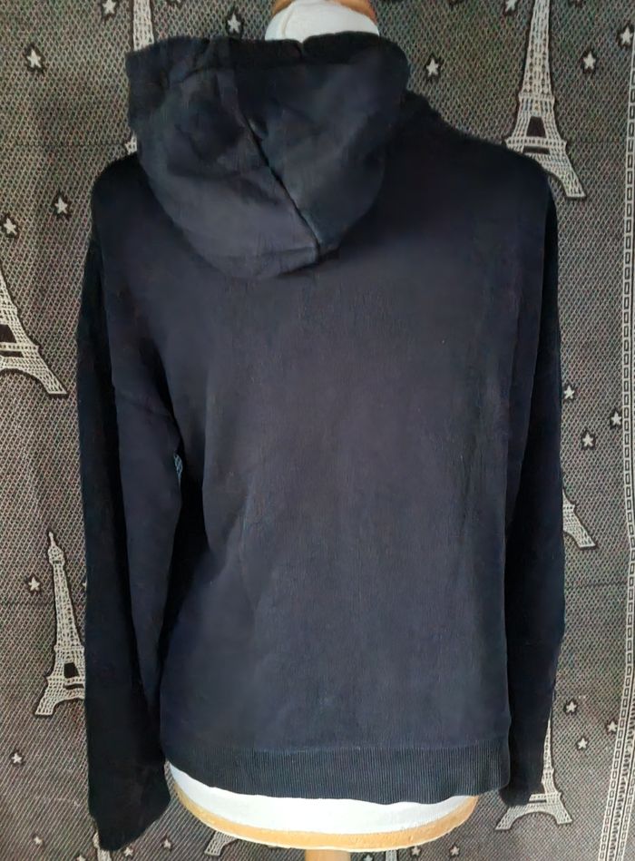 Sweat noir à capuche Nasa taille L,poche ventrale, longueur 62cm, largeur 49cm, longueur épaule à aisselle 20cm, largeur aisselle à aisselle 55cm, longueur manche 48cm.