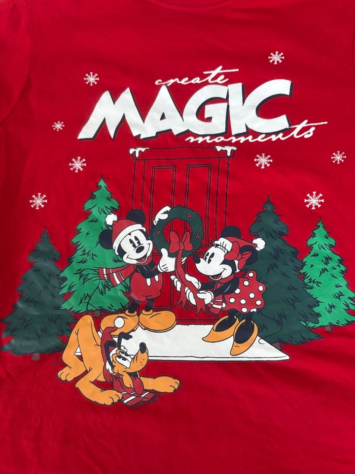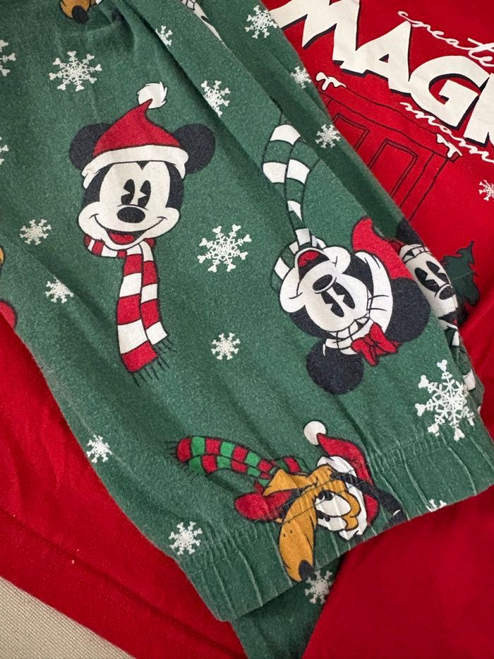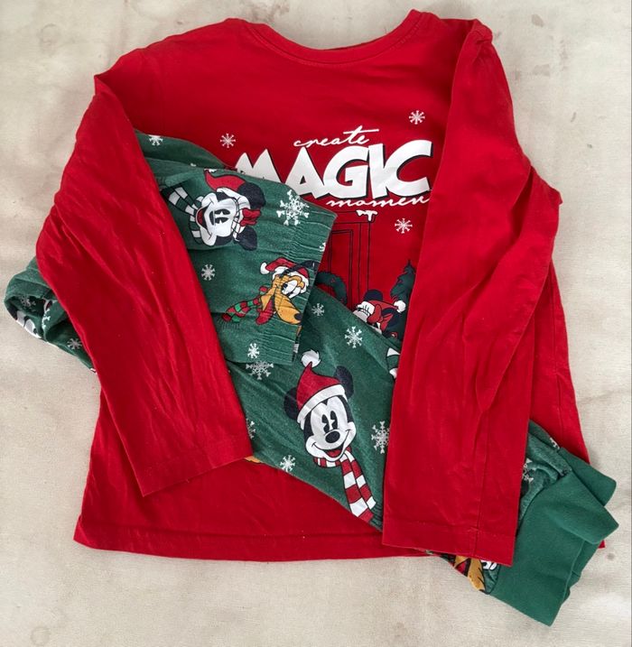 Pyjama motif Noël Haut rouge manches longues avec motif impression Pantalon vert foncé légèrement décoloré motif neige/personnages