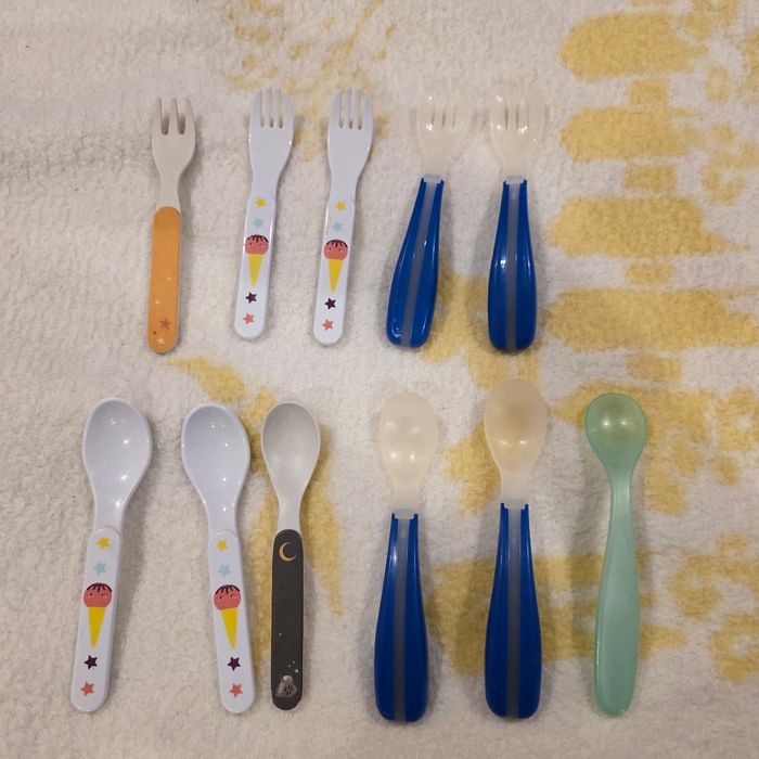 Lot de 5 fourchettes et 6 cuillères en plastique. En bon état.